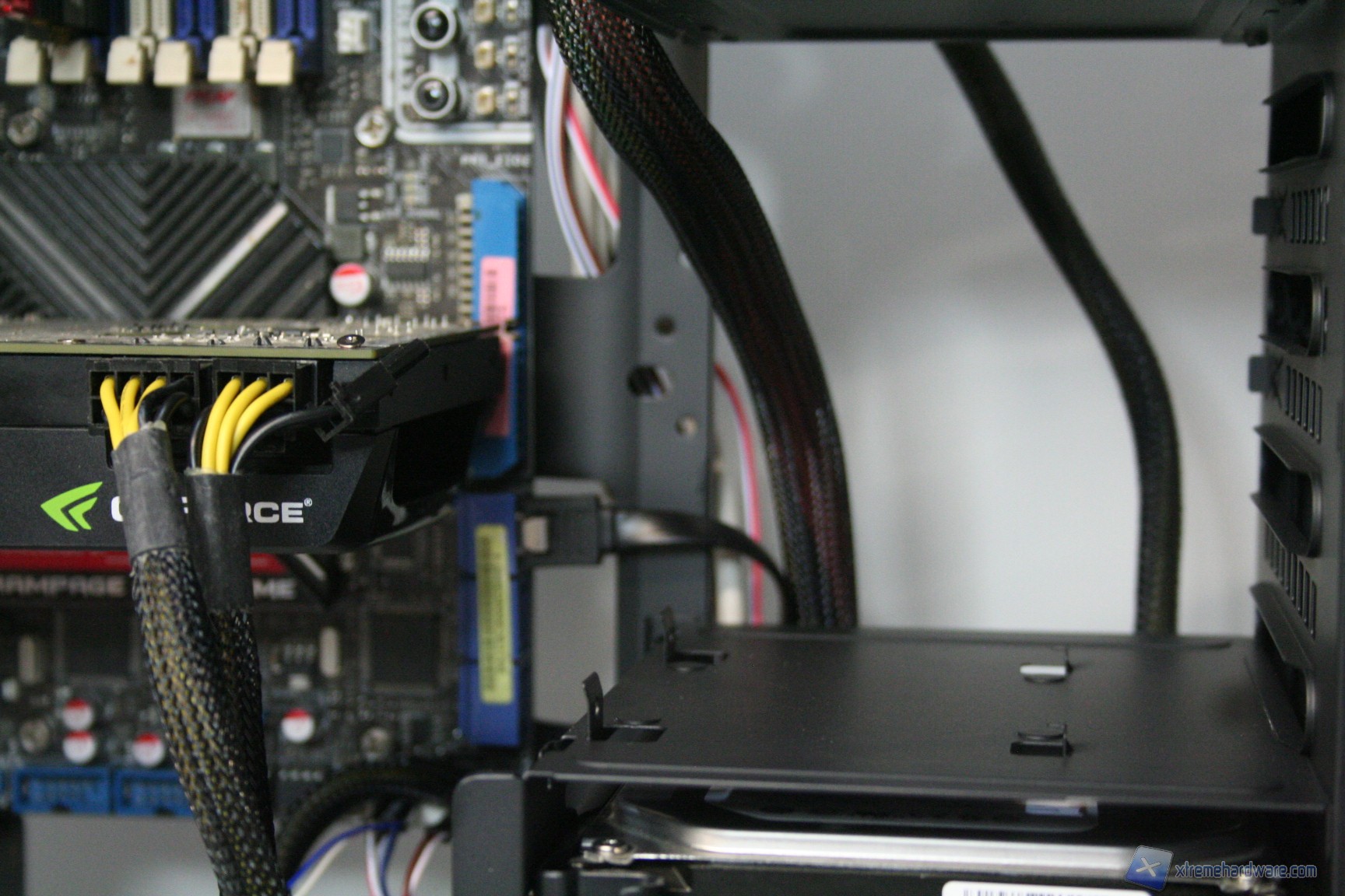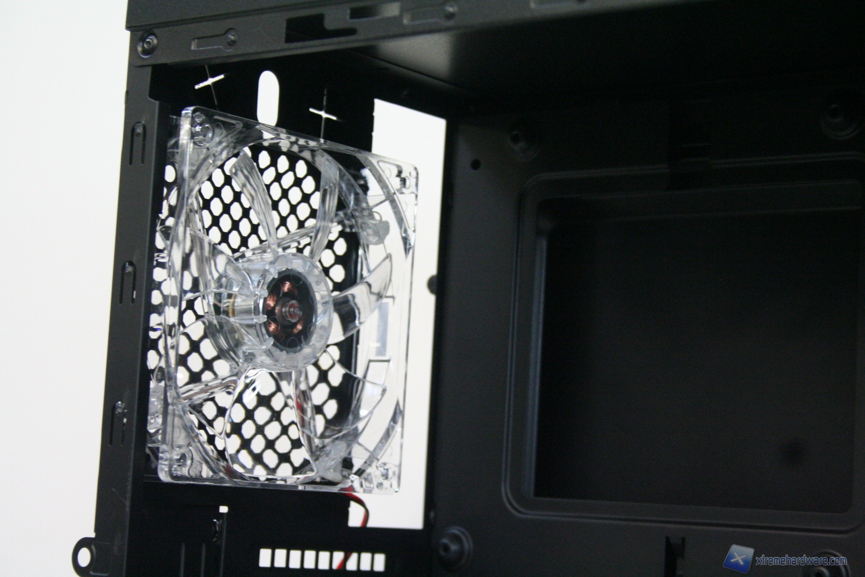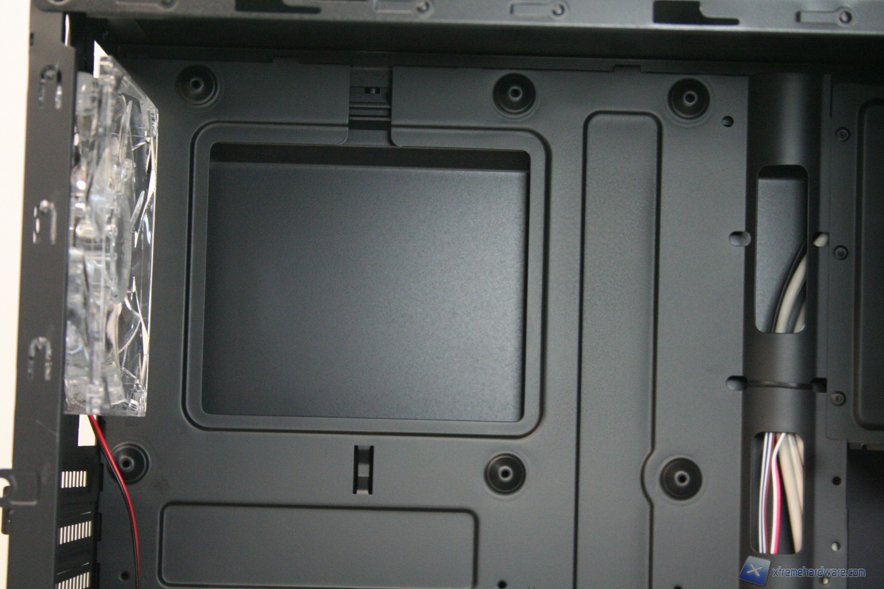 Il piatto della scheda madre è interamente in acciaio, e diversamente da alcuni modelli di cabinet top di gamma degli anni passati, non è removibile. Sono presenti tre aperture e ci ricorda molto modelli simili al Dragon Rider, recensiti qualche anno fa. Le fessure sono sprovviste di gomma antitaglio ma data la lavorazione non ci sarà nessuno rischio per le nostre dita, o i connettori di alimentazione. La compatibilità sulla carta è limitata allo standard ATX ma siamo stati comunque in grado di montare una E-ATX Asus Rampage II Extreme. Frontalmente troviamo una predisposizione per due ventole da 120mm in immissione, ma In Win ne ha montata solamente una.