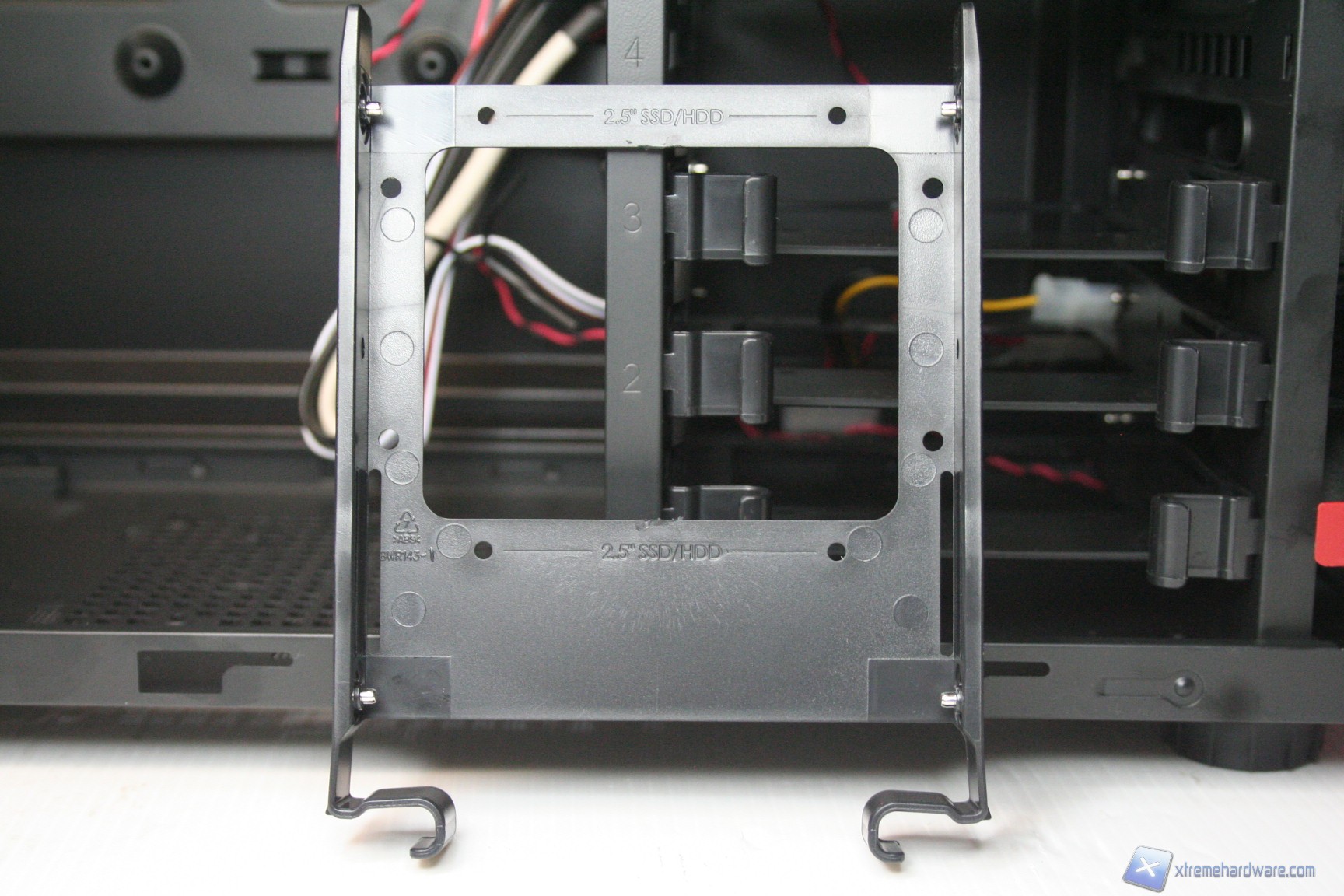 Vi mostriamo alcune fotografie del comparto SSD e dei cage per HDD superiori. Sono presenti quattro predisposizioni per dischi da 3.5" e 2.5", oltre a tre slot per periferiche da 5.25", anche se una sola ovvero quella superiore sarà accessibile dall'esterno. Oggettivamente, ciò potrebbe portarci a pensare che il design del frontale del case sia posteriore a quello, reference, del telaio (utilizzato anche per altri modelli proprietari di fascia medio/bassa).