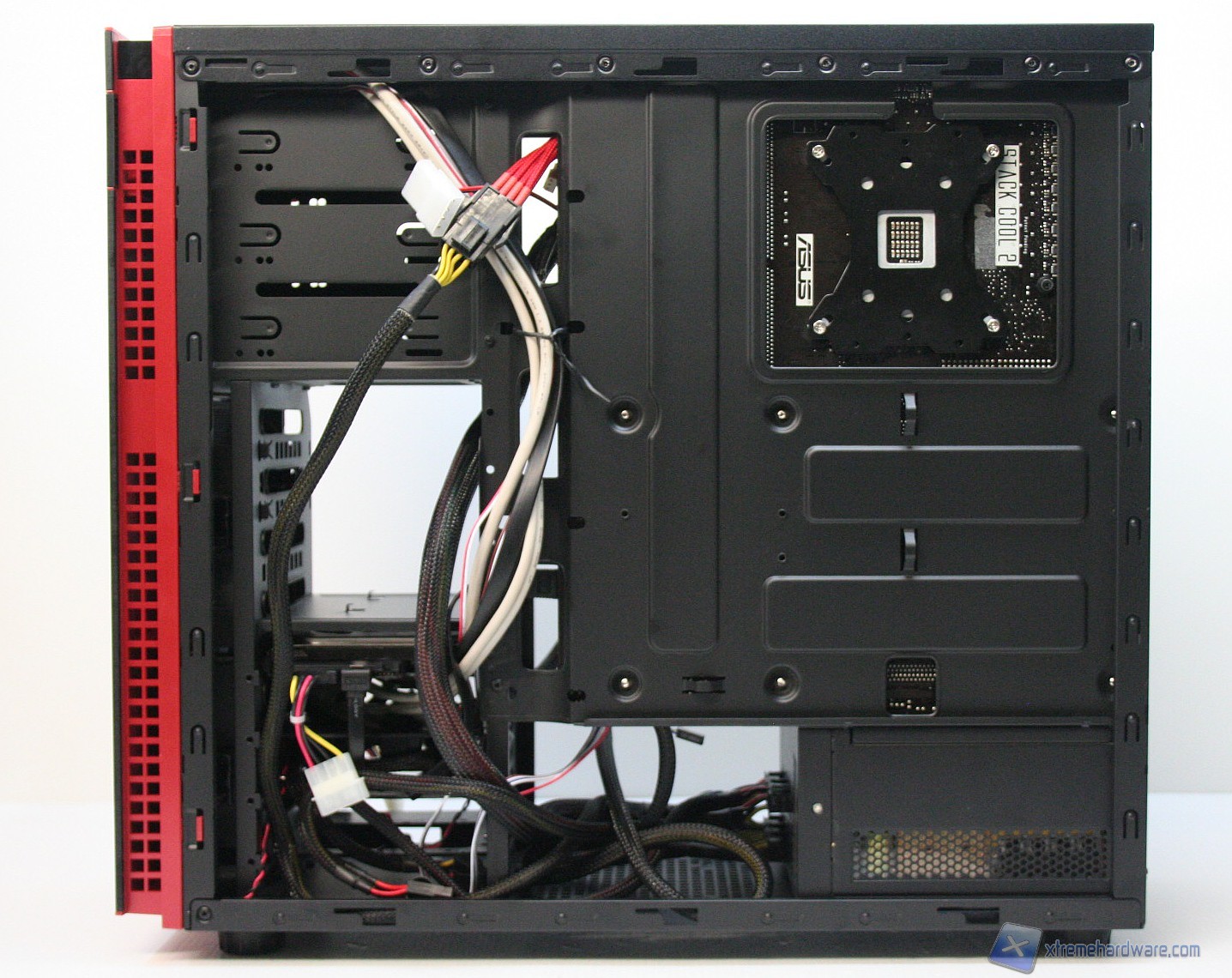 Il posizionamento dell’alimentatore è classico, quindi nella parte inferiore e posteriore dello chassis. Non sono preinstallati distanziatori gommati antivibrazione, né sono forniti nel bundle purtroppo. La lunghezza massima è tale per cui si potranno installare anche modelli con wattaggio superiore ad 1KW, si consiglia però di utilizzare modelli fino a 170mm di lunghezza. L’alimentatore si inserisce facilmente ed il fissaggio avviene tramite le consuete viti. Il cablaggio è facile, per via di un grande foro inferiore sul piatto della scheda madre, però non essendoci tolleranza posteriore, i connettori devono essere cablati frontalmente.