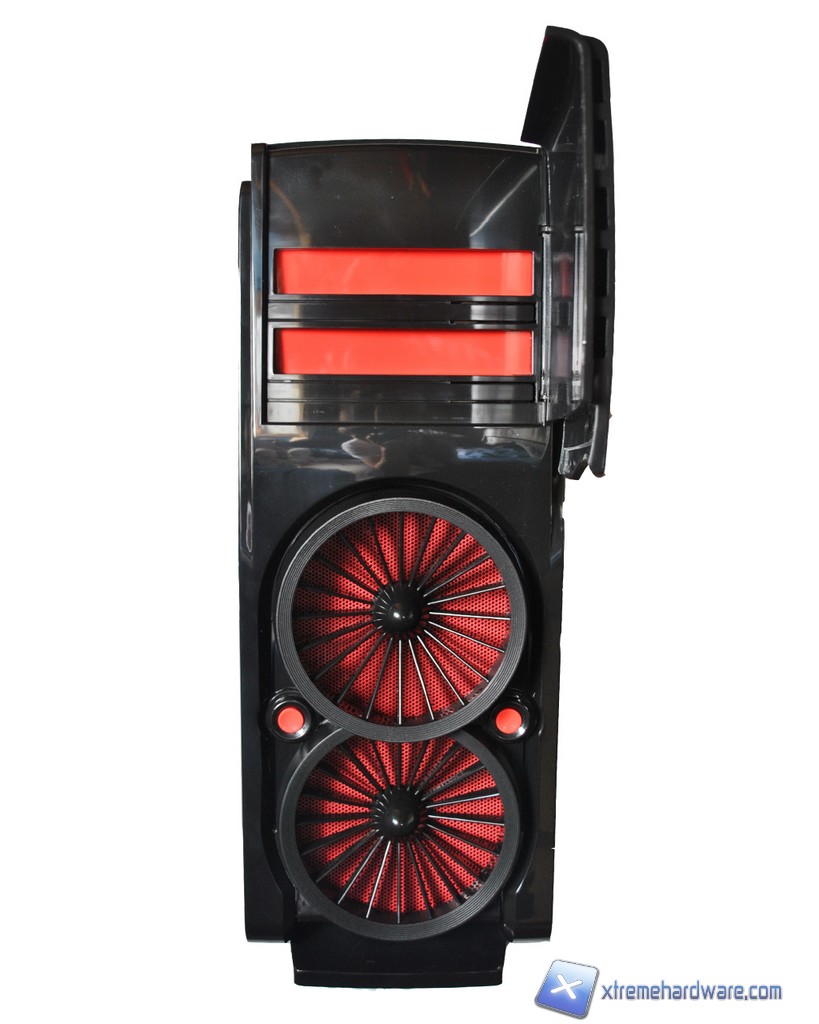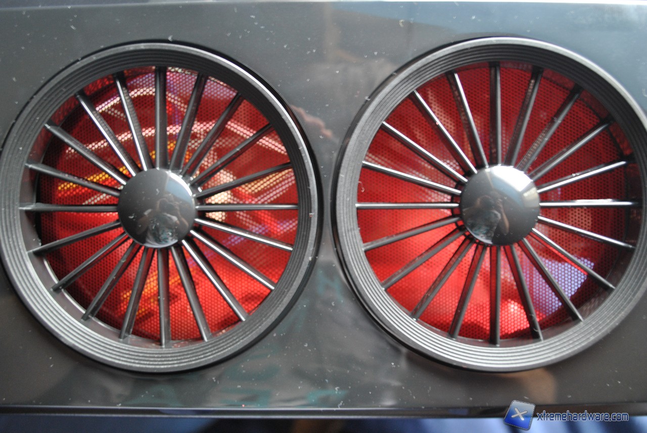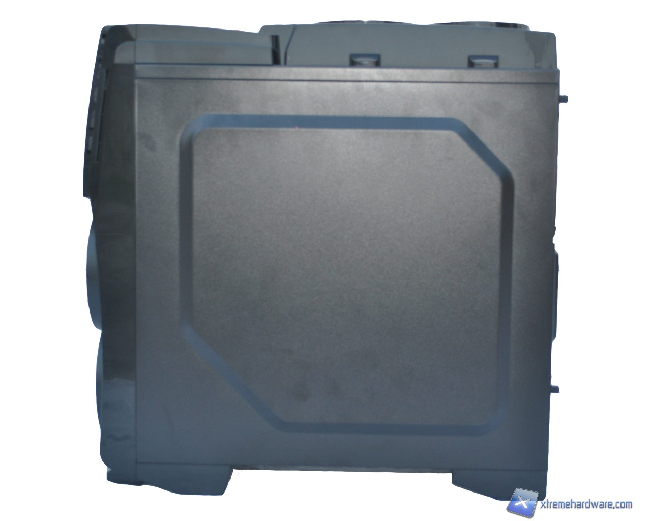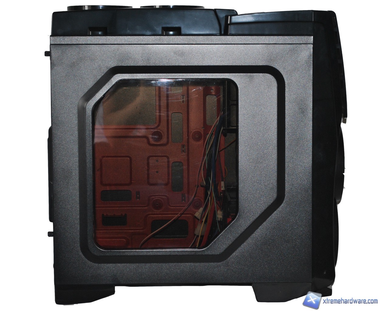 L'impatto estetico di questo case è davvero notevole, il look risulta decisamente aggressivo e lo sguardo si posa subito sul frontale caratterizzato dalla presenza di un paio di turbine, chiaro richiamo al mondo dell'aviazione. Dietro le turbine ci sono ovviamente le ventole con LED rosso. La colorazione del cabinet è un nero lucido per quanto riguarda frontale e top in plastica. Le altre superfici invece hanno un tocco più opaco essendo in metallo. Il fatto che la verniciatura delle componenti in plastica sia lucida ovviamente fa sì che queste tendano a trattenere ed evidenziare eventuali ditate. Il tema avionico è ripreso sul top dove trovano spazio altre due turbine che nascondono un alloggiamento per altre ventole da 120mm. Segnaliamo che la griglia del top atta all'alloggiamento delle ventole è removibile.