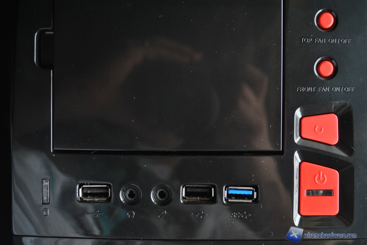 Sul top abbiamo un pannello di I/O costituito da pulsante di accensione, pulsante di reset, led HDD rosso, jack 3.5 per cuffie e microfono, fan controller a 2 vie utilizzabile attreverso cavo molex e tre porte USB di cui due di tipo 2.0 e una 3.0. Nella parte alta vi è una dock che offre la possibilita di collegare un HDD attraverso interfaccia SATA direttamente alla mainboard.