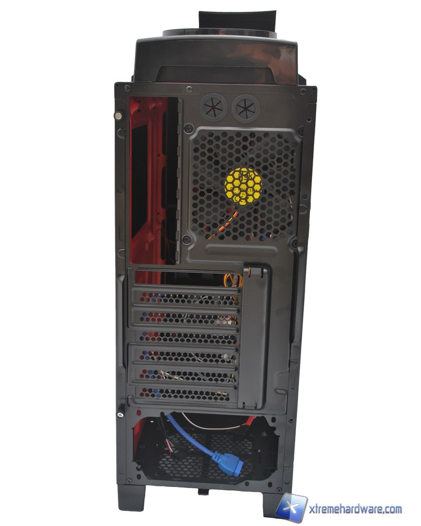 Retro e fondo del case sono estremamente simili ai prodotti della concorrenza, abbiamo perciò una ventola da 120mm in espulsione e un paio di fori per il watercooling. Sul fondo ci sono quattro piedini che rialzano leggermente il case ed una griglia di aerazione dedicata all'alimentatore corredata di filtro antipolvere.