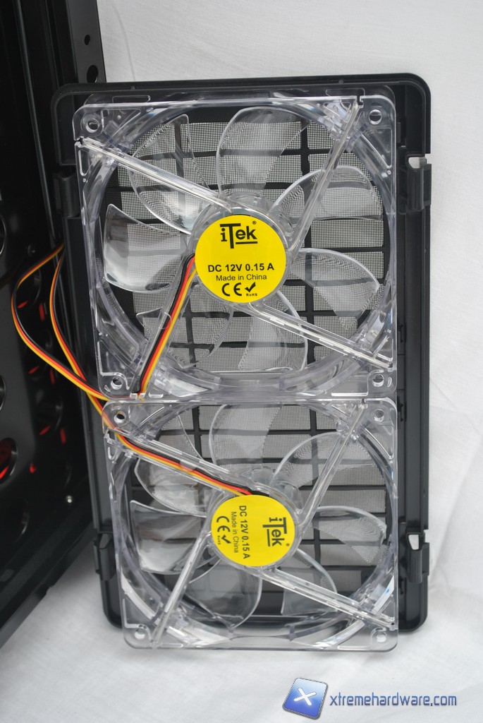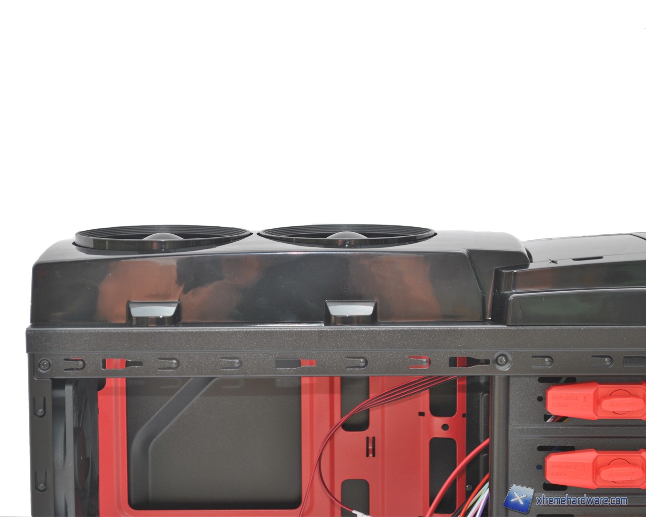 Si nota subito che anche all'interno il design è coerente con quanto mostrato esteriormente, i colori dominanti sono il rosso ed il nero. A livello costruttivo questo case si sviluppa sulla falsariga di tutta la concorrenza, essendo un prodotto di media gamma cerca di offrire soluzioni evolute con un occhio al budget, di conseguenza abbiamo una discreta organizzazione degli spazi che non contempla però un margine di manovra così ampio nei confronti dei componenti.