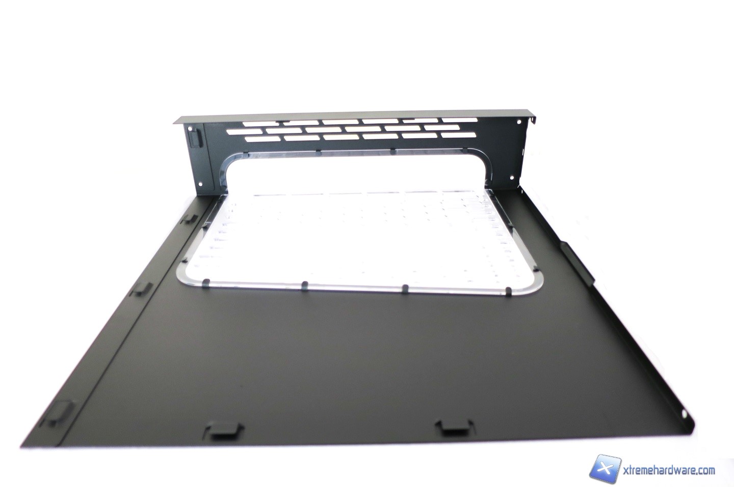 Il top così come il fondo del case non sono caratterizzati da un design classico ma piuttosto sono composti dalle due paratie ad L che chiudono il case e danno accesso alle due zone, separate, dove installare i nostri componenti. Notiamo che anche le paratie inferiore e superiore sono forate per garantire un miglior afflusso d’aria.
