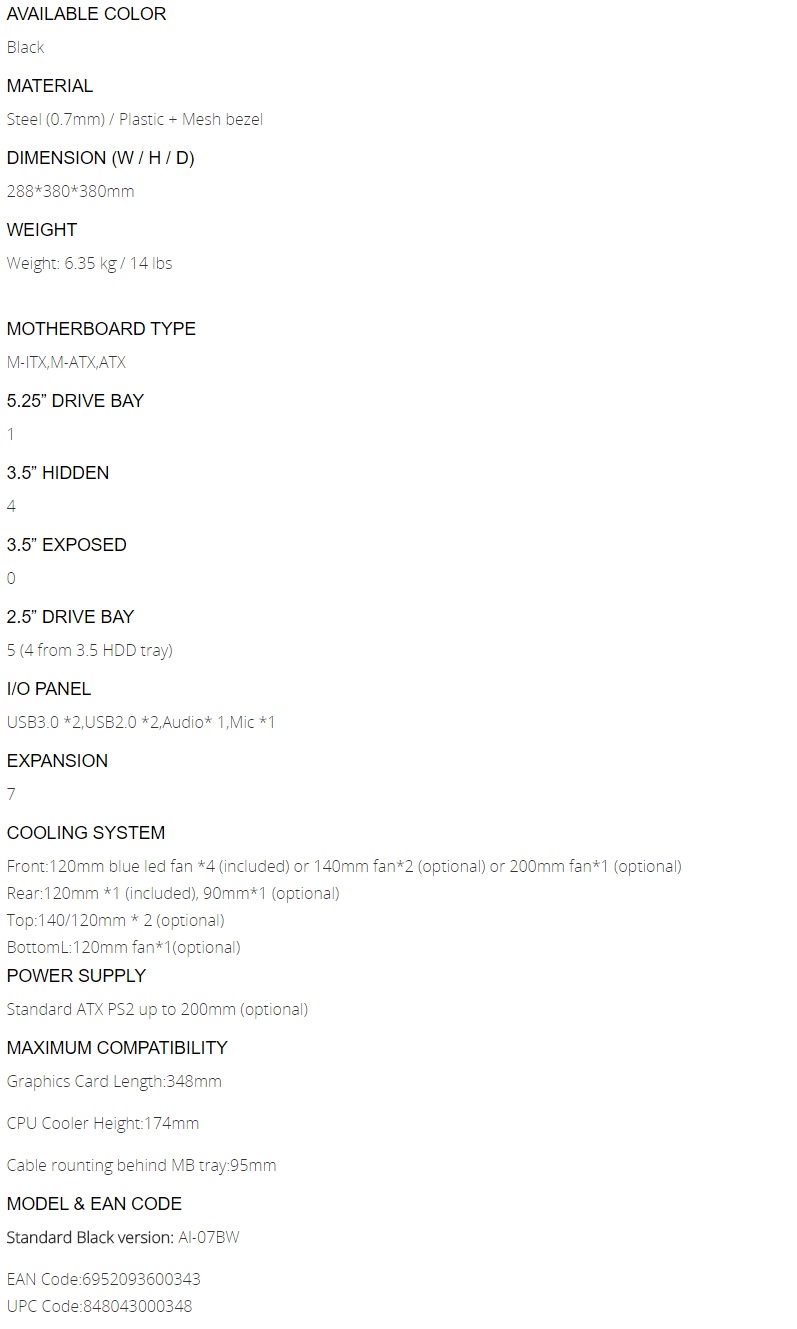 Pur essendo un case di forma cubica il AI7 Window offre un valido supporto a schede madri tra cui i classici formati ATX, Micro-ATX e Mini-ITX insieme ad una buona compatibilità per quanto riguarda ventole (fino a 8 da 120mm) e Radiatori/AIO (fino a 3 da 240mm). Lo spazio dunque non manca seppur come vedremo più in avanti dovremo prestare molta attenzione al cablaggio. La lunghezza massima per le schede video si attesta a 345mm (rimuovendo le ventole frontale preinstallate), altezza di eventuali dissipatori ad aria fino a 174mm e lunghezza massima di 200mm per gli alimentatori. Il design Dual Chamber/Doppia Camera permetterà inoltre di organizzare nel migliore dei modi i componenti HW.