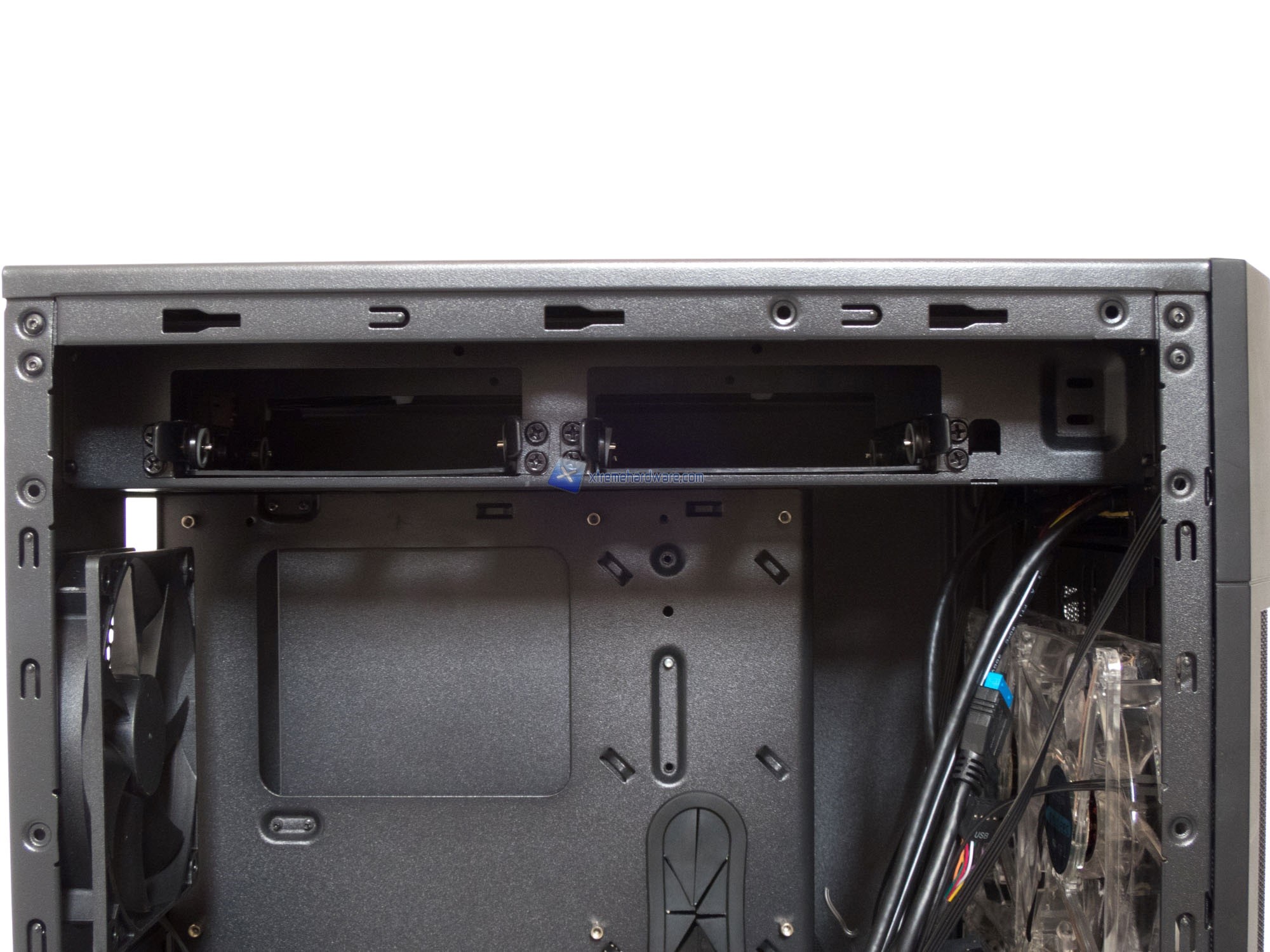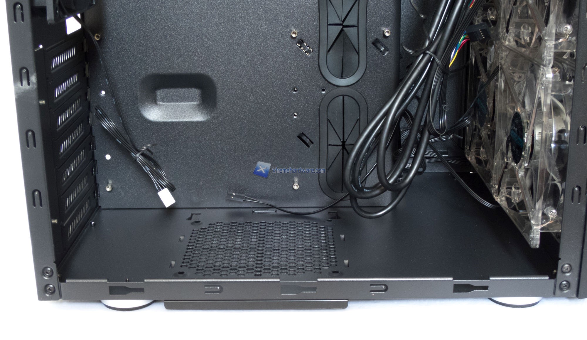 Passando al frontale nella parte interna osserviamo le ben 4 ventole da 120mm a LED Blu che forniranno un buon flusso d’aria.
