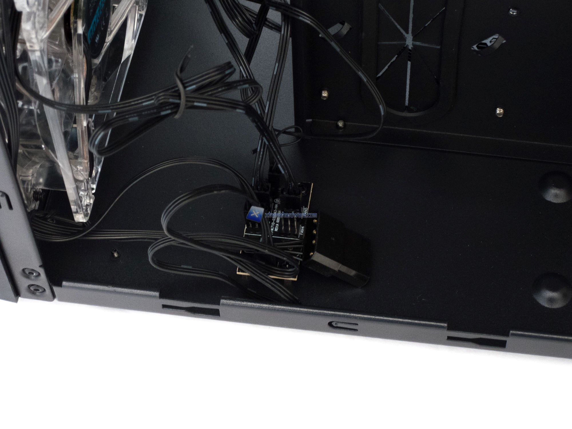 Ci spostiamo ora nella camera opposta. Osserviamo subito il Fan HUB a cui sono collegate le ventole preinstallate frontalmente. HUB dotato di un connettore Molex a 12V.
