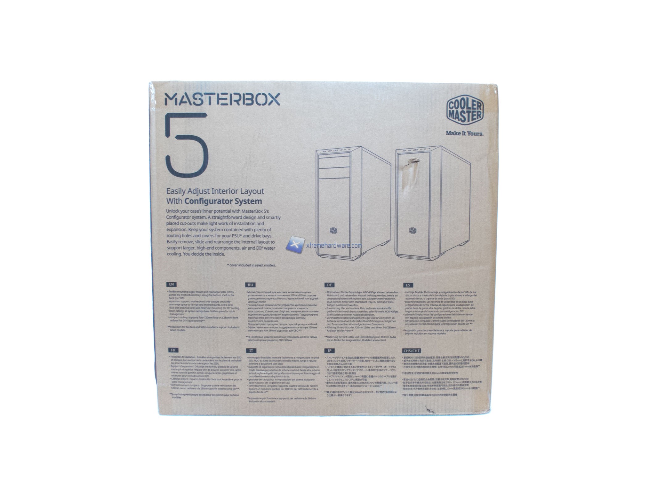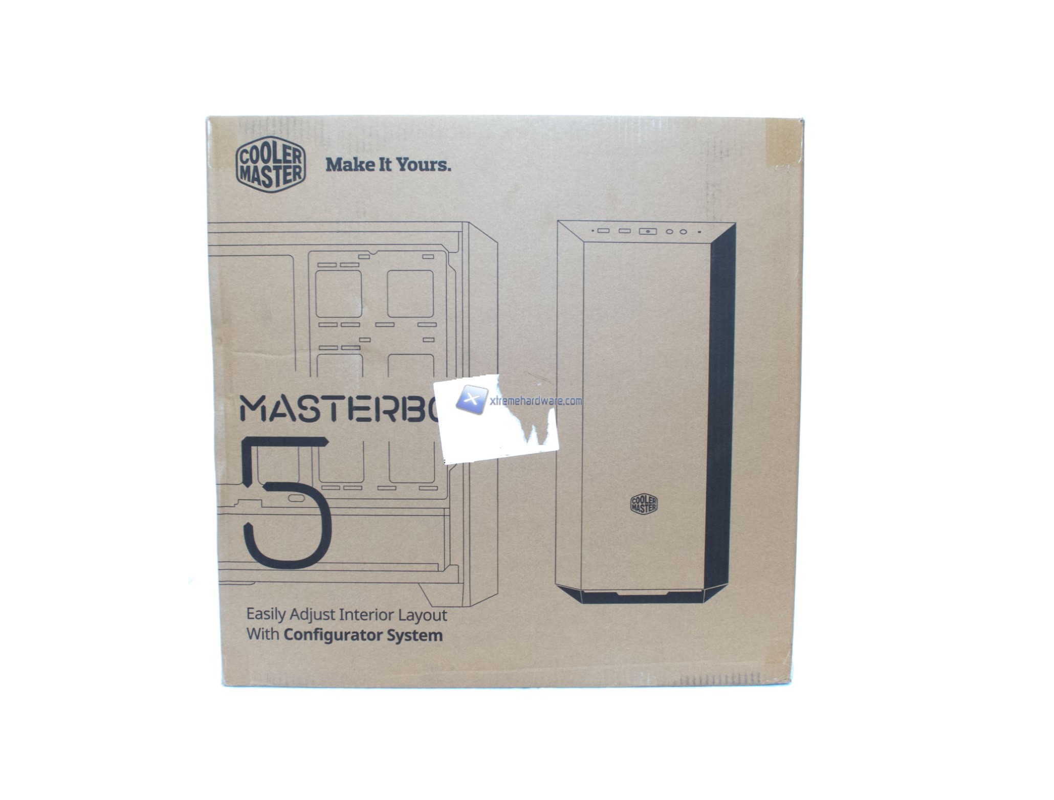 Il Cooler Master MasterBox 5 ci verrà recapitato in una classica confezione di cartone riciclato sulla quale sono ‘’disegnate’’ alcune immagini del prodotto oltre ad altre e classiche informazioni.
