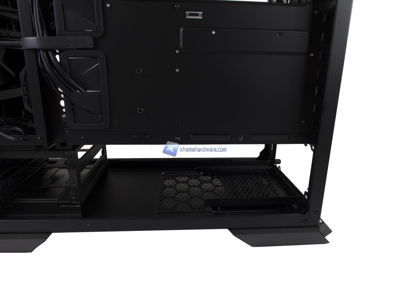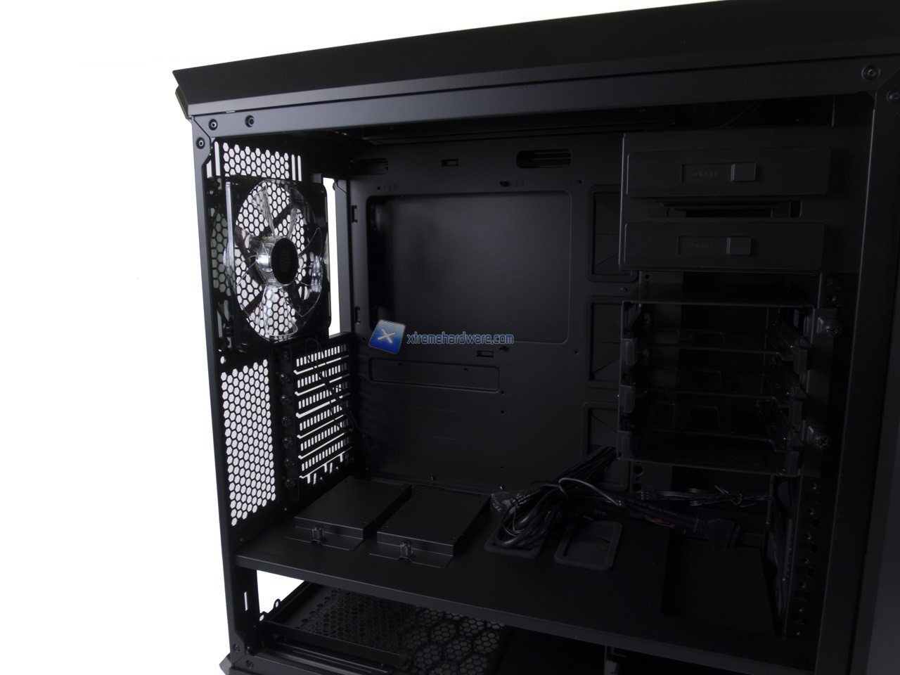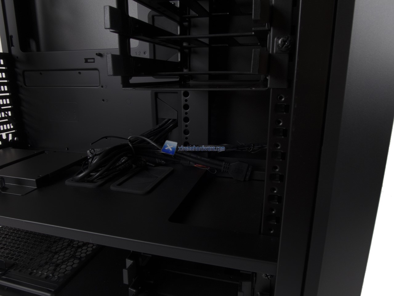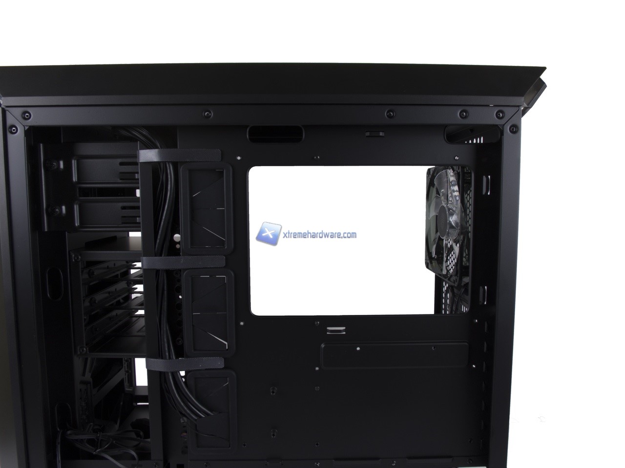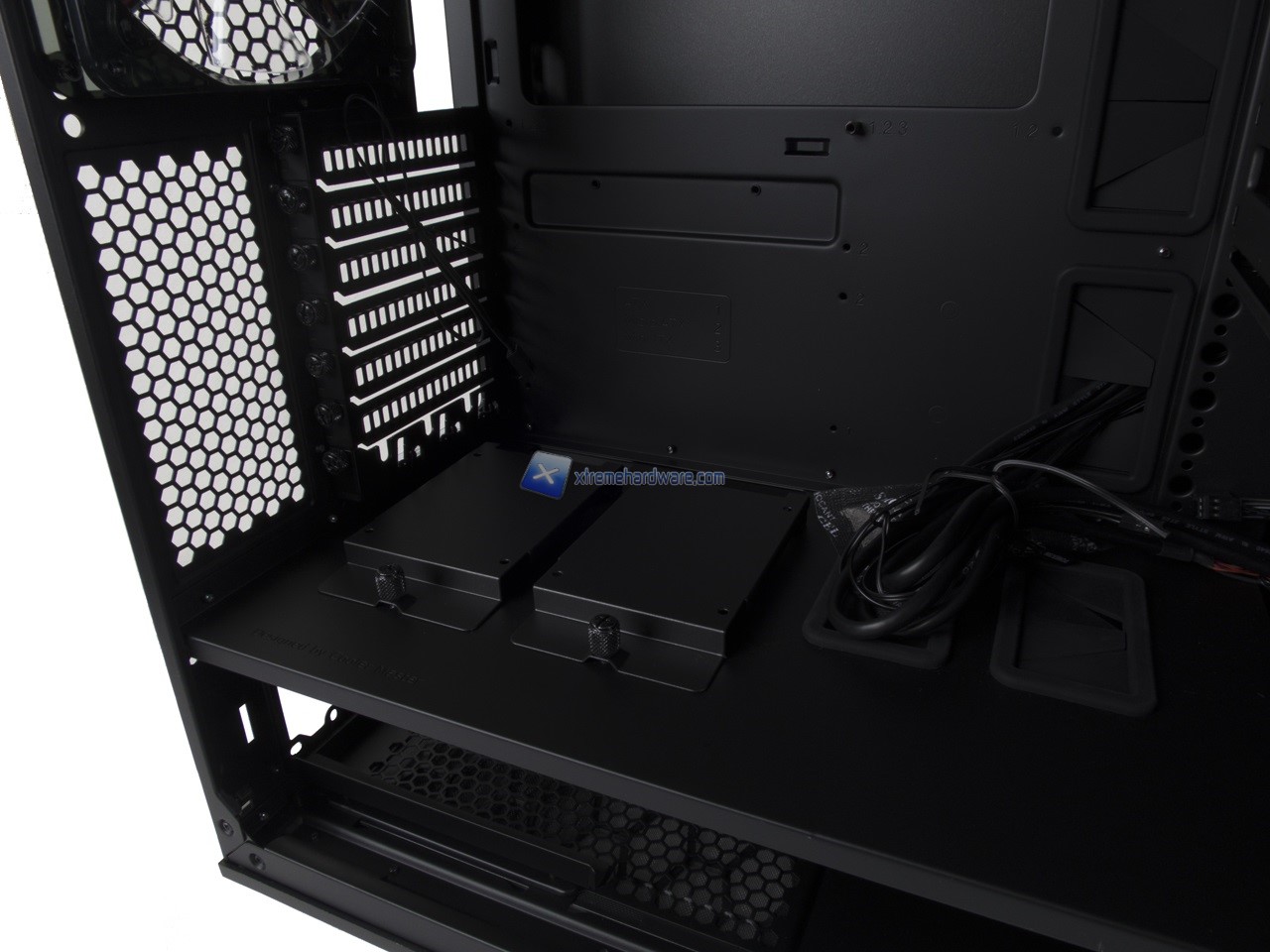 Anche qui abbiamo una disposizione standard e dunque possiamo osservare la canalina quasi centrale dedicata ai cavi provenienti dal Top/Frontale che insieme a fettucce in velcro potranno aiutare il cablaggio anche dei cavi dell’alimentatore. Nel lato destro potremo, come per i modelli precedenti, riutilizzare inoltre le staffe/supporti per SSD per posizionarne due in posizione verticale nel retro Tray della scheda madre.