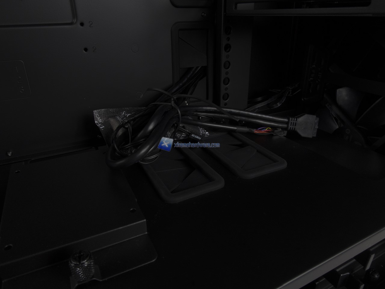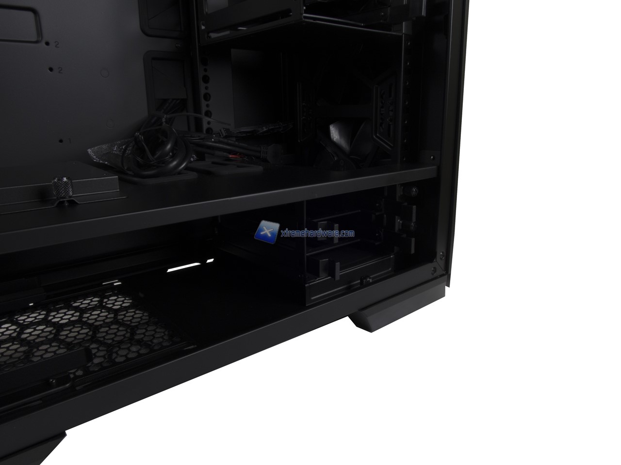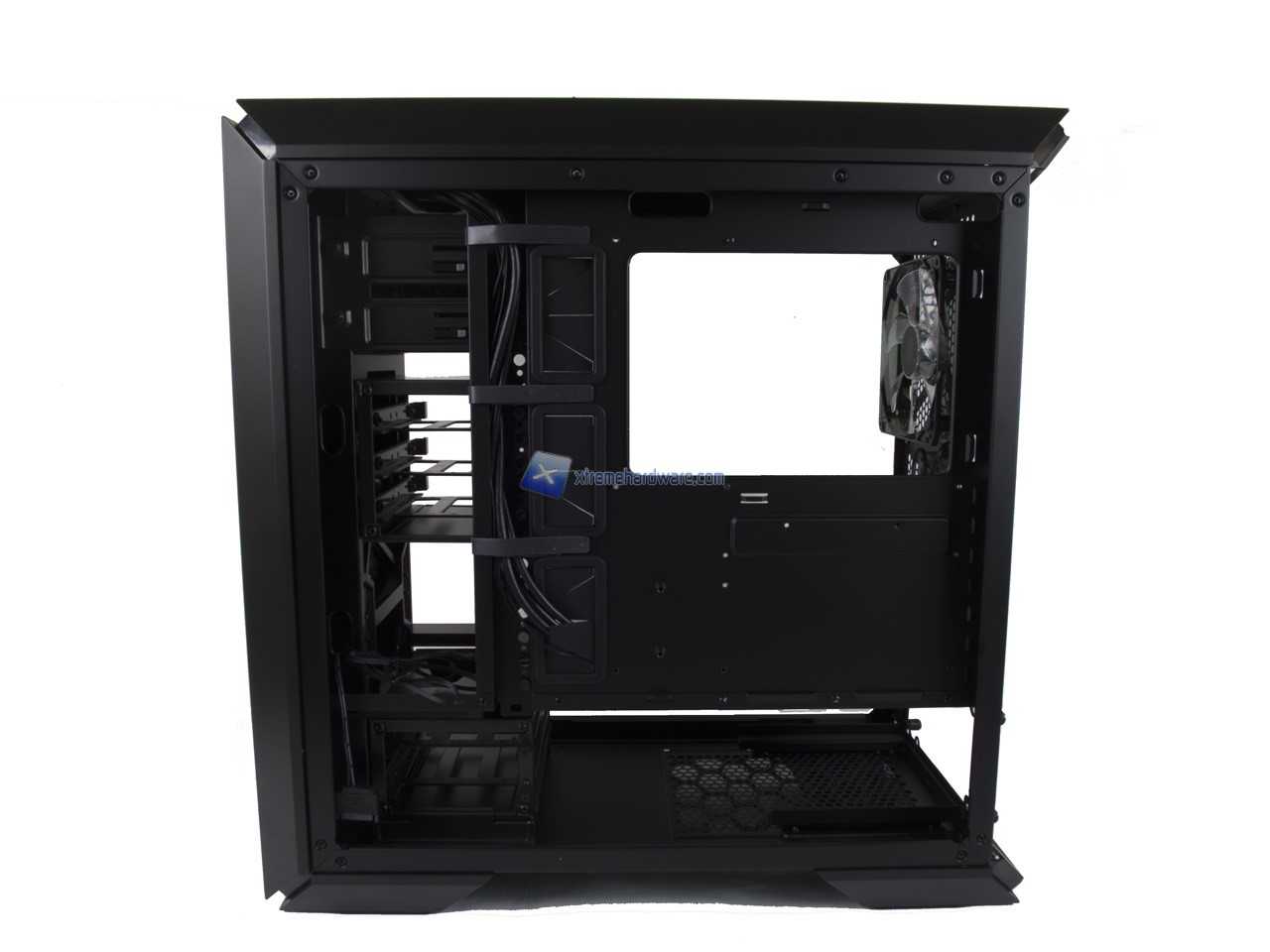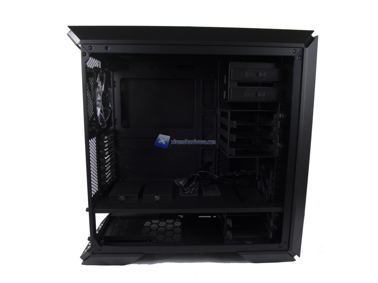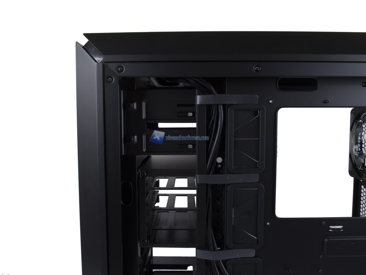Anche qui abbiamo una disposizione standard e dunque possiamo osservare la canalina quasi centrale dedicata ai cavi provenienti dal Top/Frontale che insieme a fettucce in velcro potranno aiutare il cablaggio anche dei cavi dell’alimentatore. Nel lato destro potremo, come per i modelli precedenti, riutilizzare inoltre le staffe/supporti per SSD per posizionarne due in posizione verticale nel retro Tray della scheda madre.