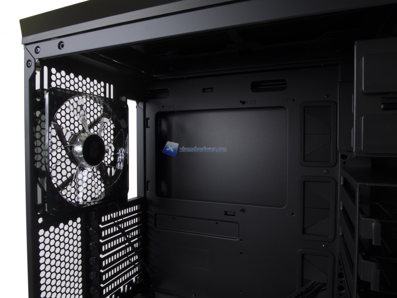 Rimossi dunque i pannelli laterali possiamo finalmente accedere all’interno del MasterCase Pro 6. Inutile dire come lo spazio a disposizione e in particolar modo la struttura e layout sia identici a quanto visto per gli altri modelli della famiglia e serie MasterCase. Spazio che potrà aumentare o diminuire a seconda del grado di modularità che applicheremo alla nostra Build (dicasi rimuovere/aggiungere eventuali Cage).