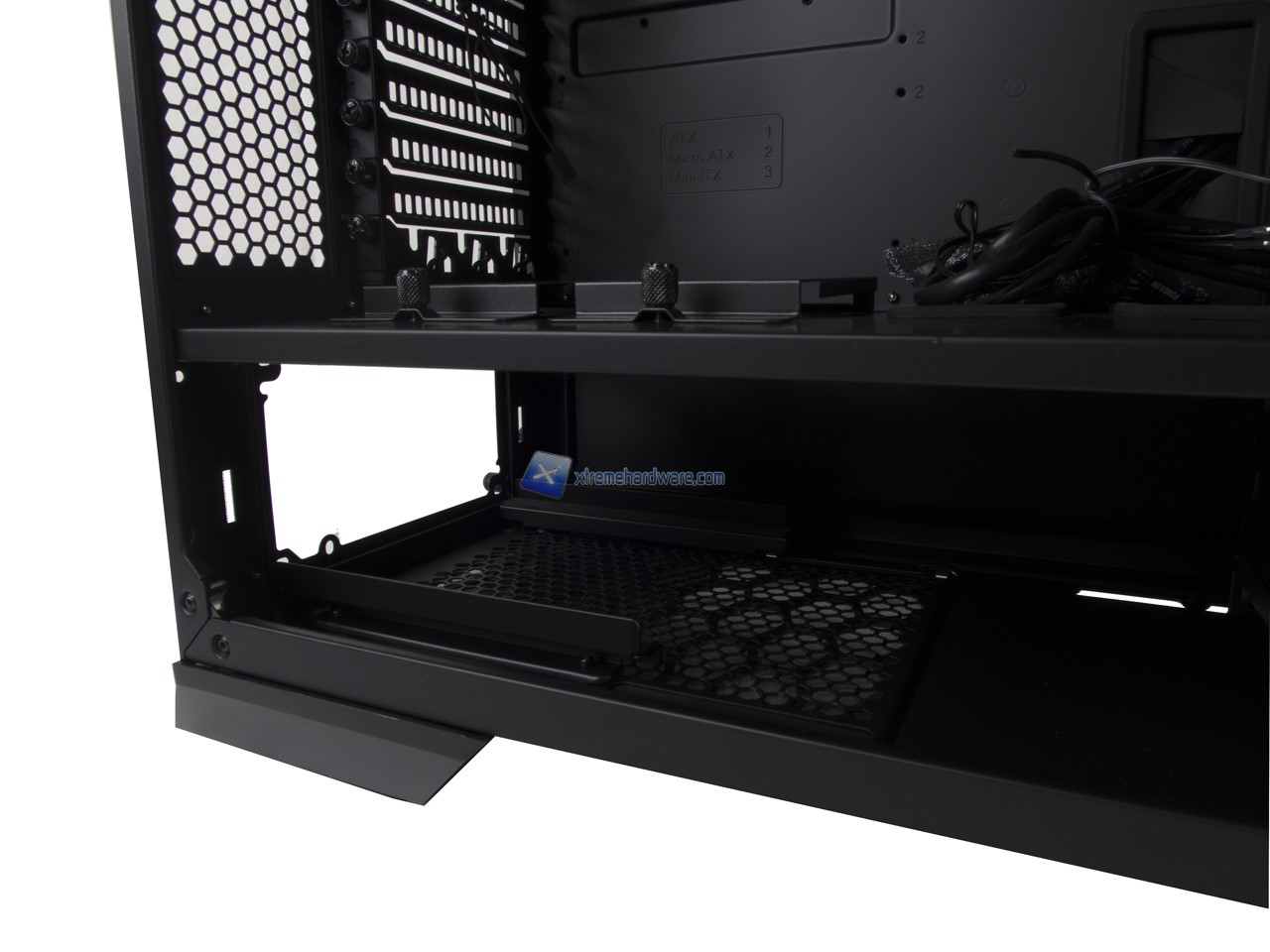 Partendo dalla zona centrale e dunque dal Tray della scheda madre avremo un Tray in acciaio contornato da due fori superiori privi di passacavi in gomma e tre laterali con i medesimi. Altri due fori saranno presenti per i cavi destinati alla/alle VGA sul Midplate.
