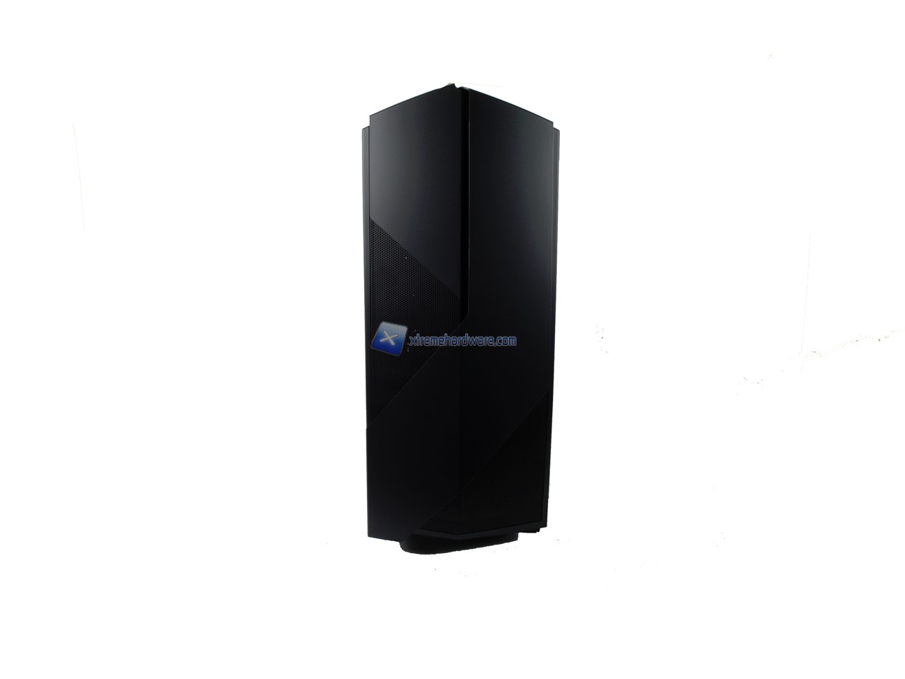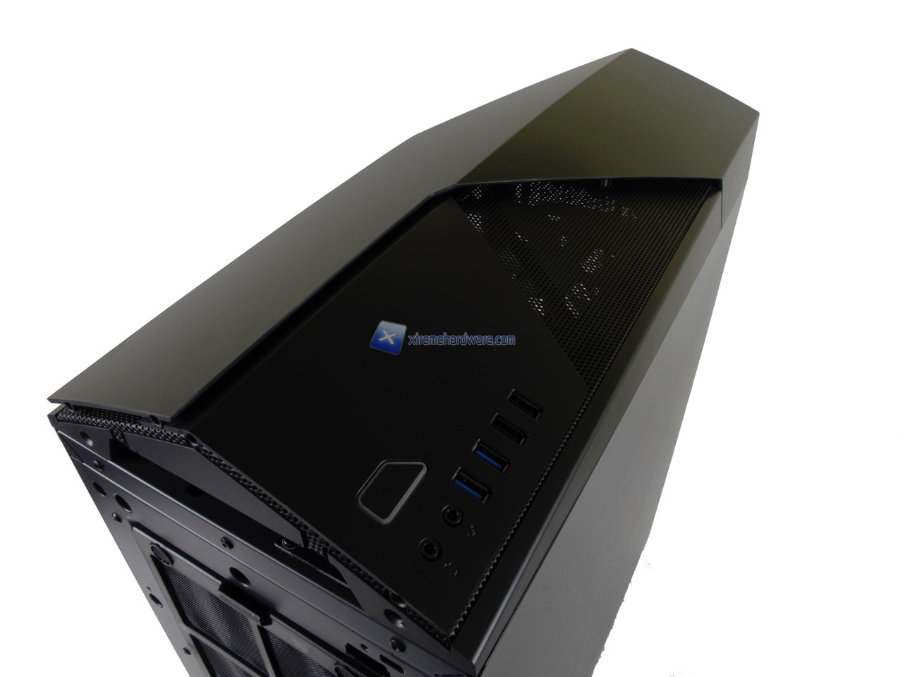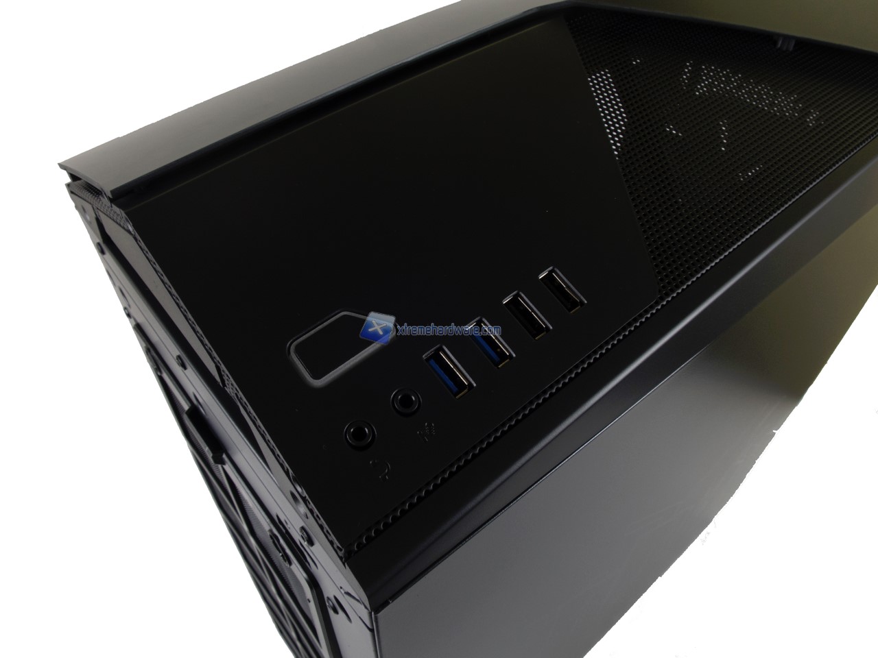 Iniziamo la classica analisi dell’esterno dal frontale. Osserviamo sin da subito non solo l’assenza di griglie e bay da 5,25’’ ma anche il design aerodinamico e particolare del case. Il pannello frontale così come quello superiore si basano su una griglia in mesh sulla quale è applicato un profilo sagomato in plastica.