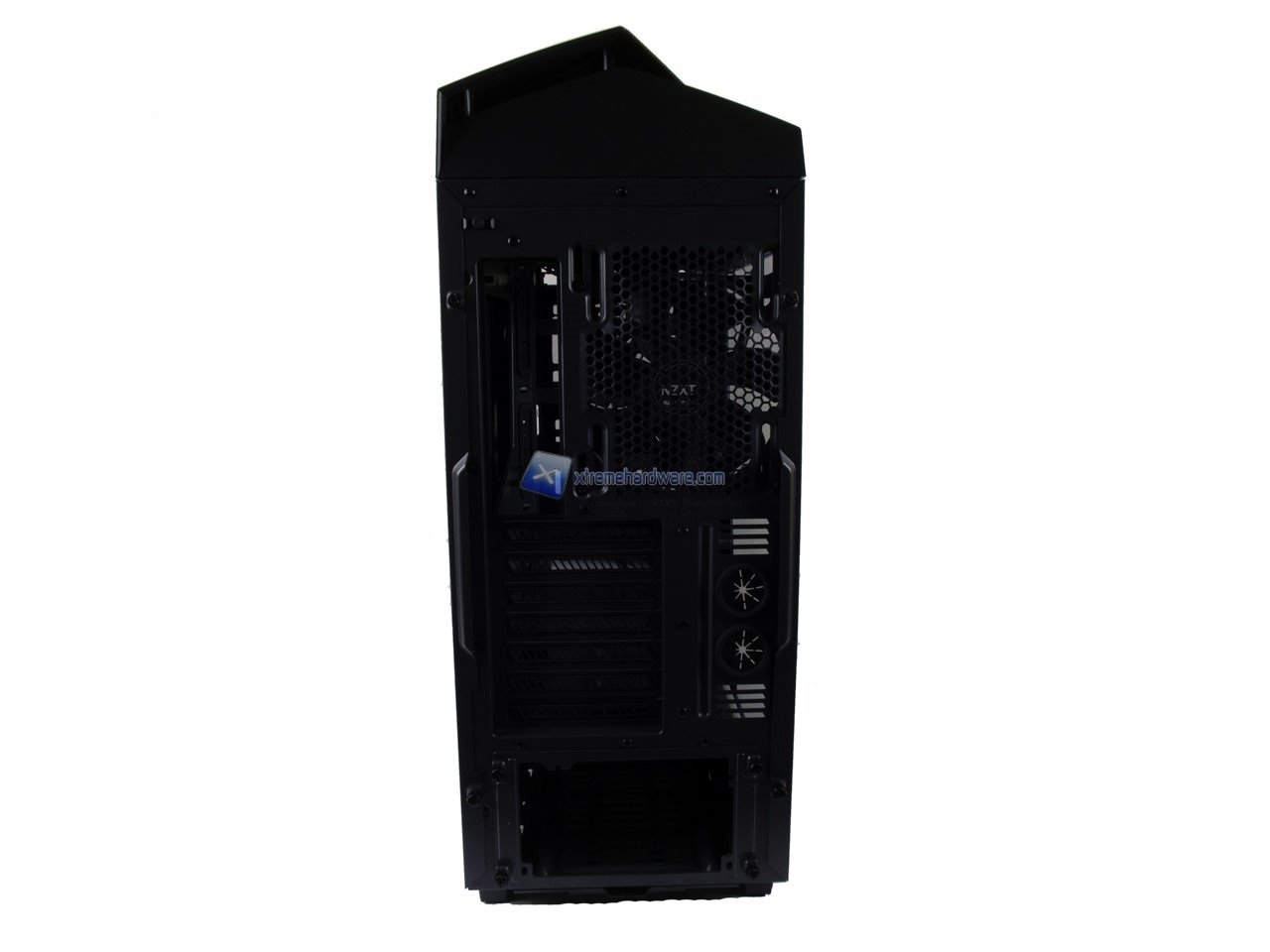 Arriviamo al retro del case. Partendo dall’alto il foro per l’I/O Shield con a lato la griglia con annessa ventola preinstallata FN V2 da 140 mm, a seguire 7 slot PCI e due fori laterali per creare un loop esterno e infine il foro per la PSU. Ricordiamo sempre che NZXT addotta una staffa aggiuntiva che dovrà essere rimossa e applicata alla PSU prima di poter procedere all’installazione.