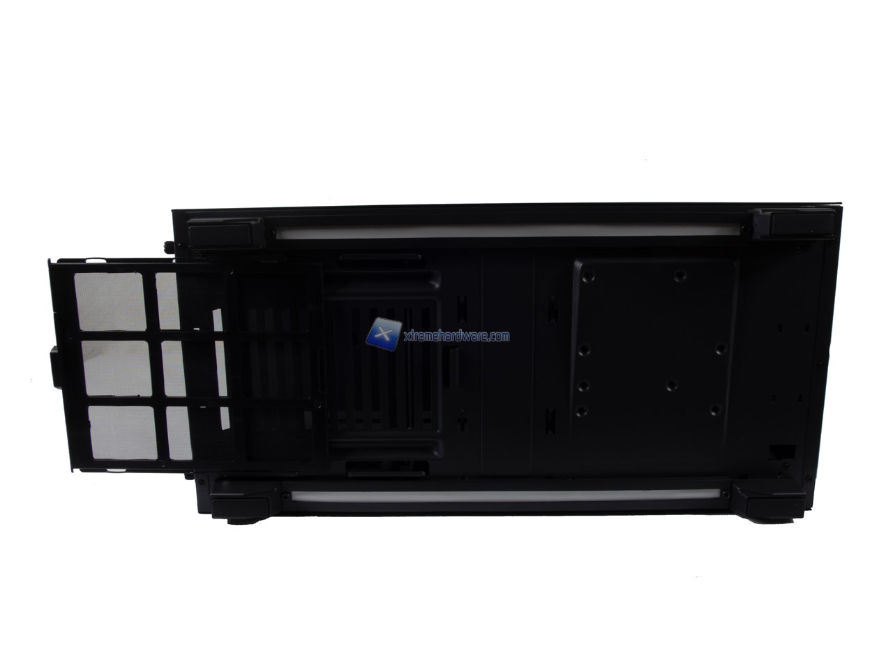 Giungiamo nel lato inferiore del case. Qui non sfugge sin da subito la presenza di due strisce LED, come visto in altri modelli del brand, che completeranno il sistema di illuminazione a LED e personalizzazione del case. Presente un filtro antipolvere in corrispondenza della ventola PSU. I piedini sono in plastica con un inserto in gomma antiscivolo.