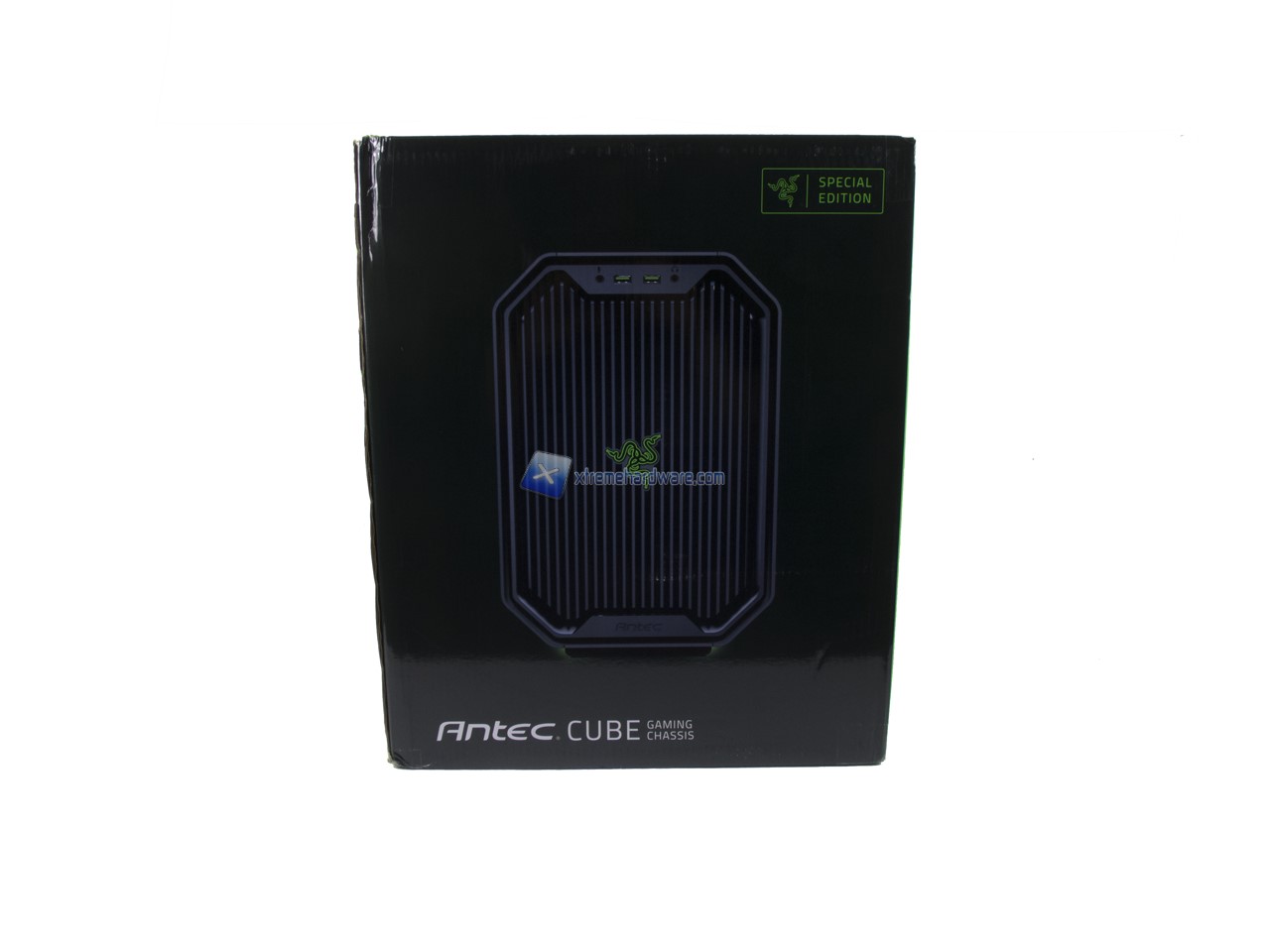 Il nostro Antec Cube Razer Edition ci giungerà in una consueta confezione di cartone con superficie lucida e a tema Razer, naturalmente, con tutte le classiche e principali immagini e informaizoni. Le dimensioni della confezione idealmente rappresentano quelle del case cubico visto che anche questa è di forma cubica/parallelepipeda che si estende verso l’alto. Il case è posto in verticale all’interno.