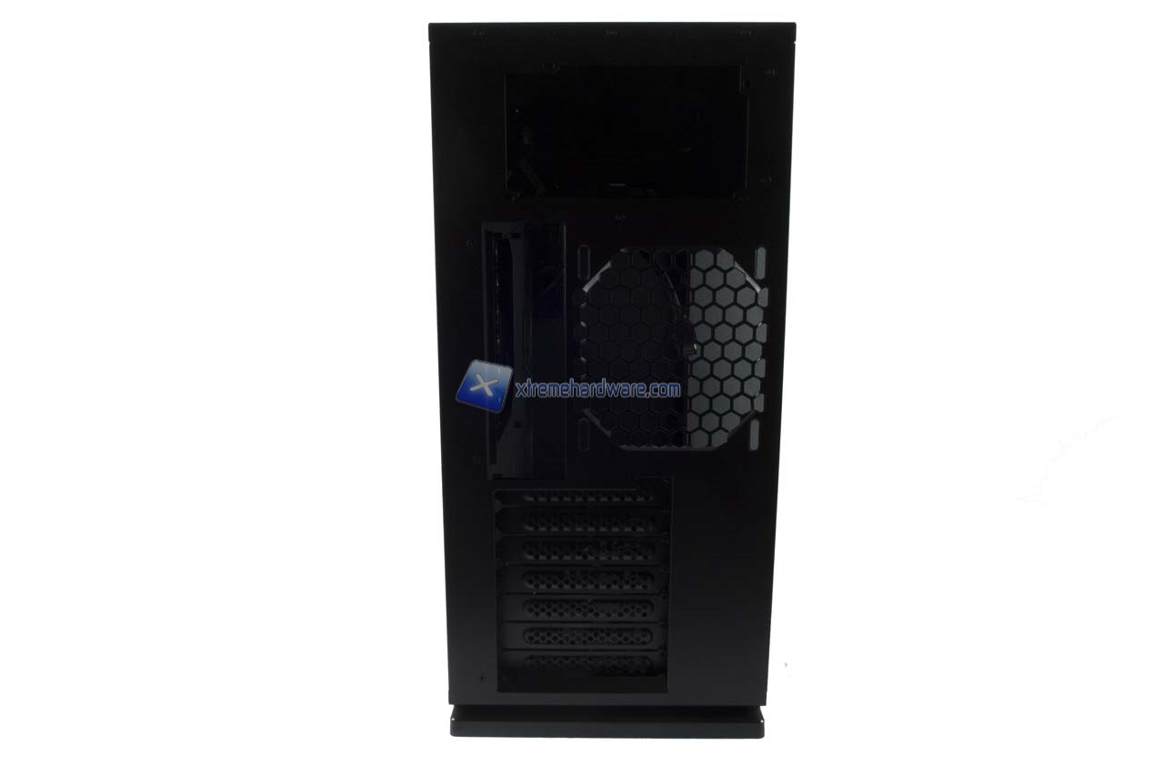 Passiamo ora nel lato posteriore dove osserviamo l’ormai consueto Layout di moltissimi modelli In Win. Dall’alto verso il basso troviamo il foro per l’alloggiamento, dall’interno, dell’alimentatore, il foro per l’I/O Shield con a lato la griglia per una ventola opzionale da 120 mm e infine i sette slot PCI-E.