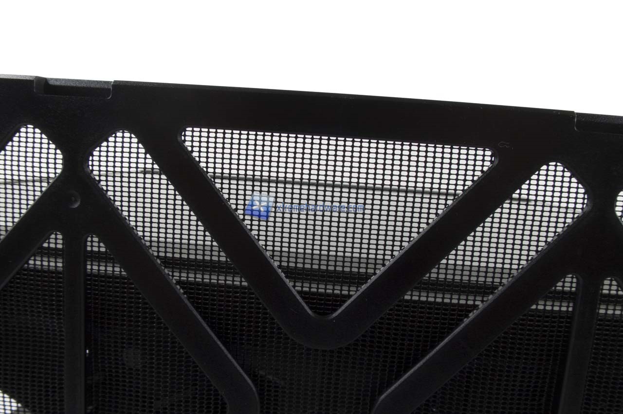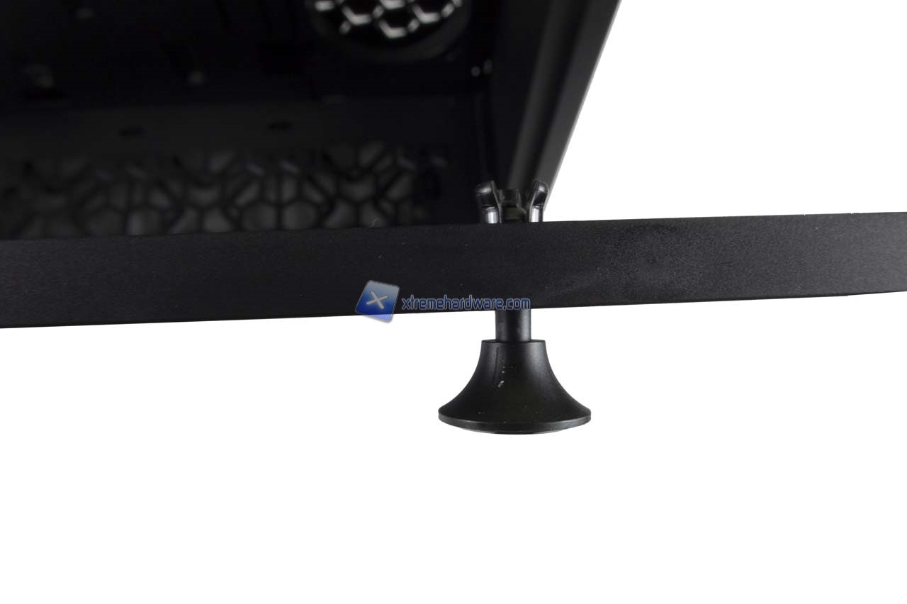 Nel lato inferiore troviamo invece due piedini in plastica di medie dimensioni a fungere da base stabilizzante per il case e centralmente il filtro antipolvere removibile in corrispondenza dei fori per l’installazione nella parte inferiore di un radiatore da 360 mm o tre ventole da 120 mm.