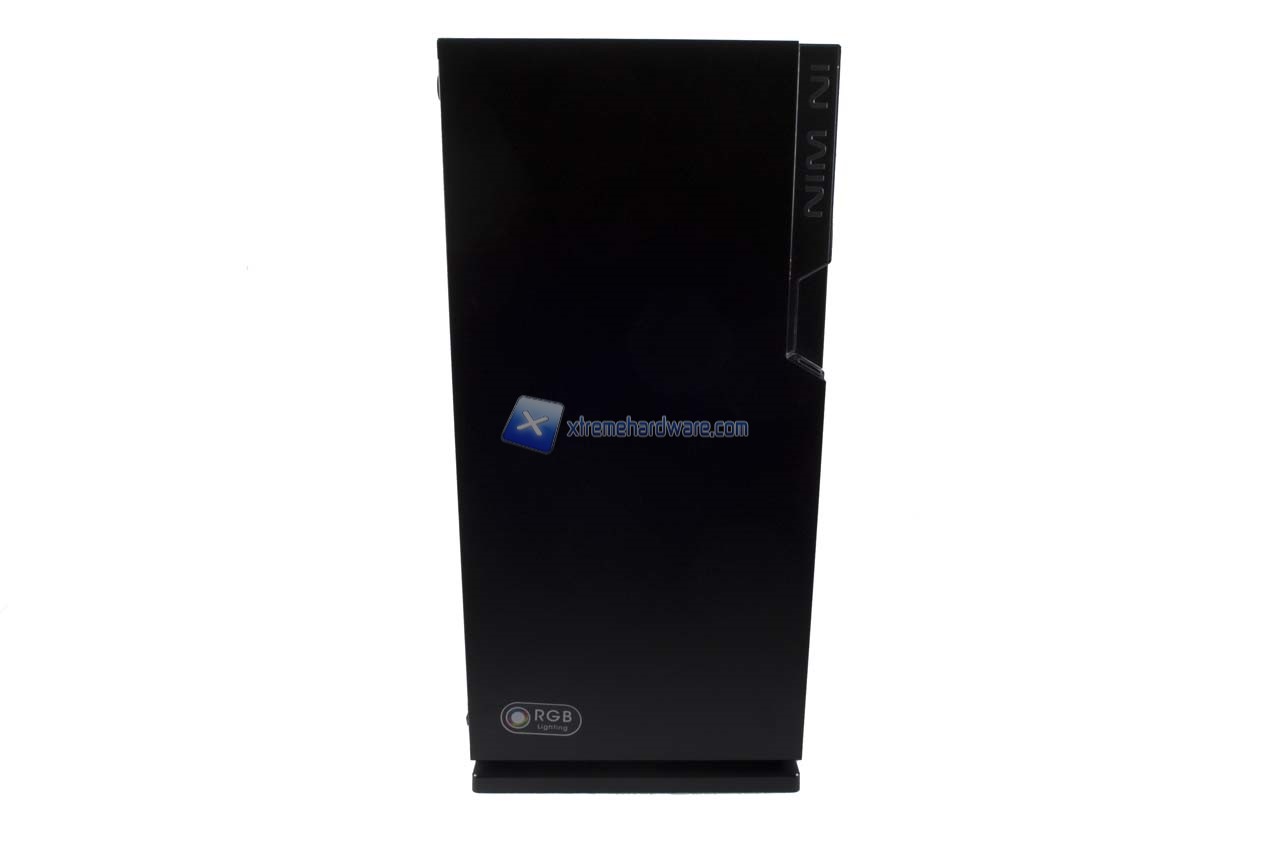 Il pannello frontale rigorosamente chiuso mostra nella parte alta laterale l’inserto in plexyglass con la serigrafia del logo In Win. Questo inserto sarà retroilluminato da un’illuminazione di tipo RGB garantita collegando il cavo interno all’Header della scheda madre.