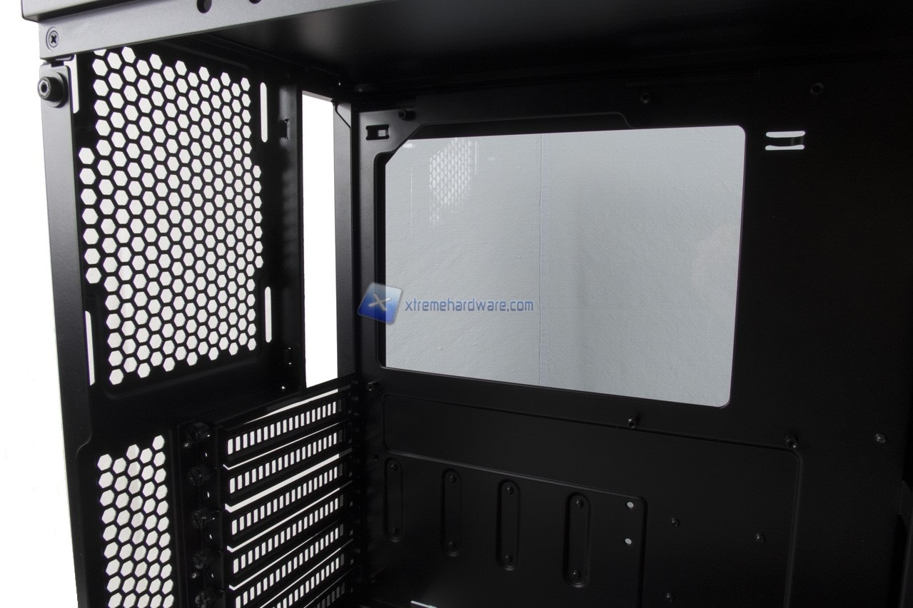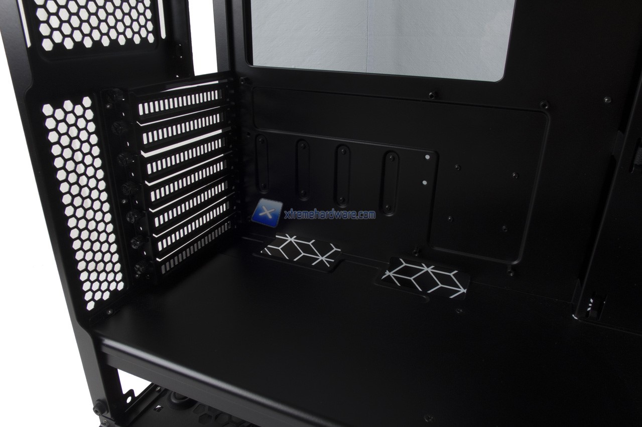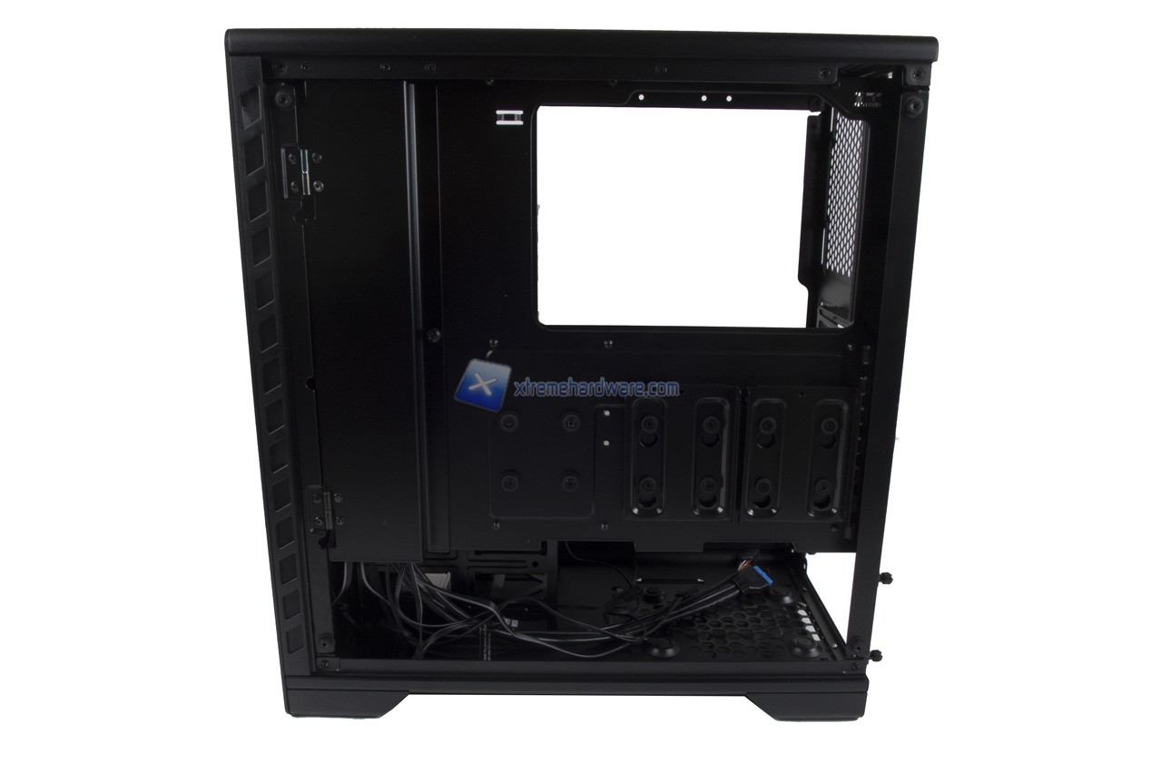 Il lato frontale mostra al solito un Tray della scheda madre con un ampio foro per l’installazione successiva di eventuali dissipatori ad aria o AIO. A lato sono presenti fori verticali per il cablaggio laterale.