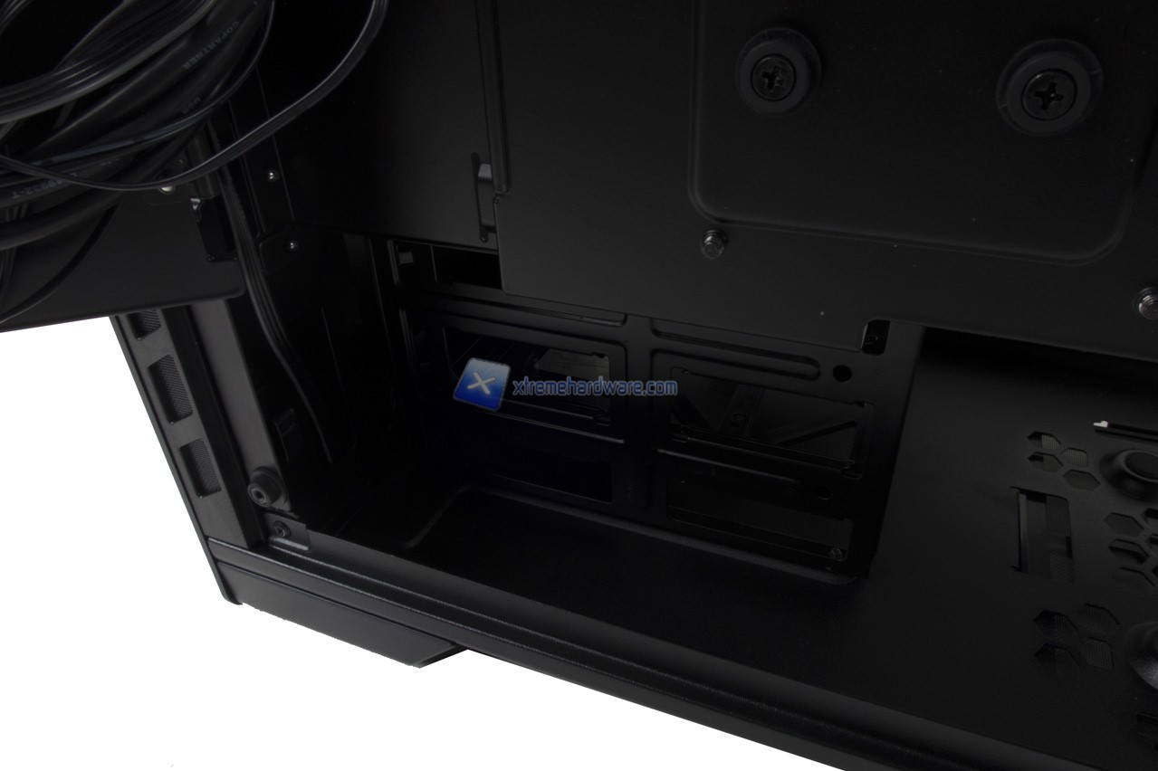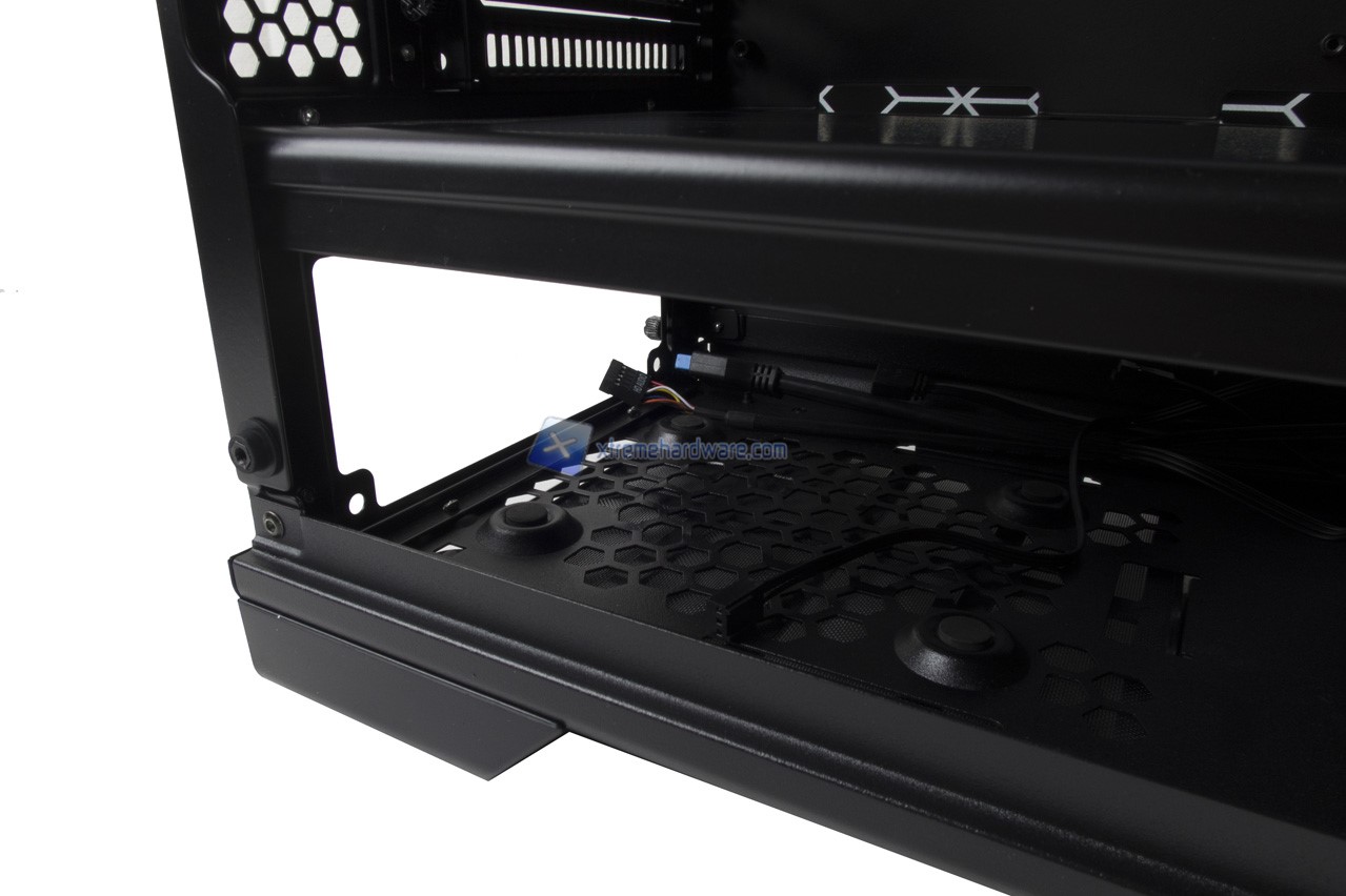 Nel lato inferiore lo sportellino è possibile osservare il Cage con due slitte per Hard Disk classici o SSD. L’accesso al suddetto Cage dovrà avvenire dal lato frontale rimuovendo il pannello frontale.