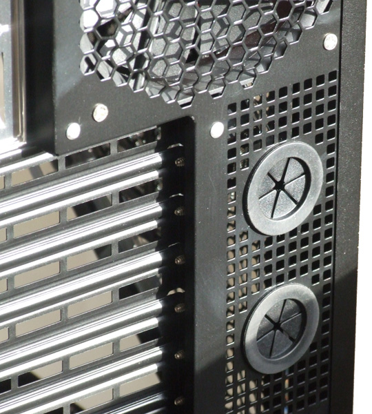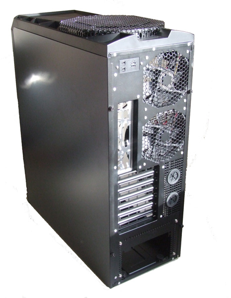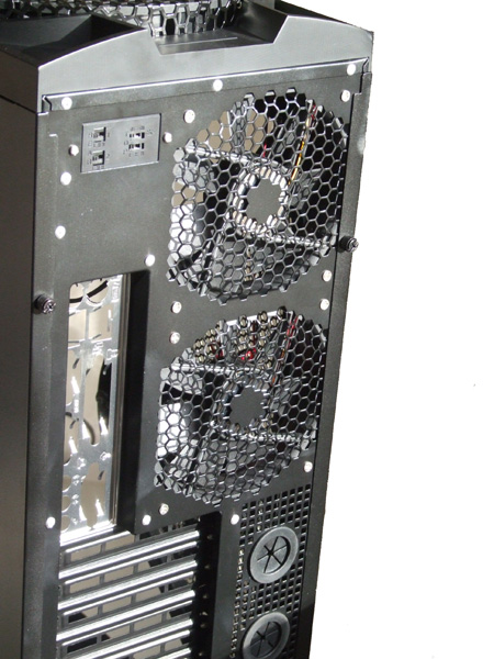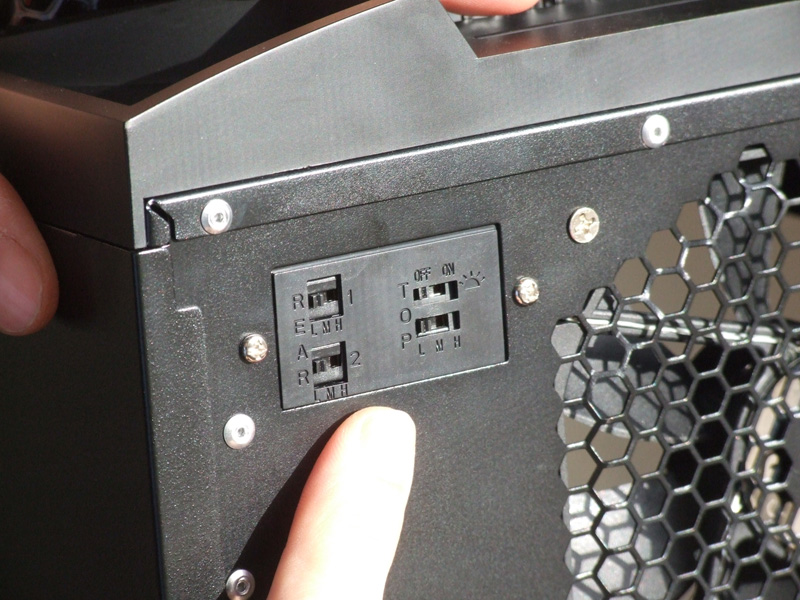 Il retro di questo case ha una certa importanza, partendo dal basso e salendo troviamo innanzitutto (come già era nel vecchio ninehundred) la predisposizione per l'alimentatore, quindi gli slot per le schede di espansione (PCI, PCI-e etc.) affiancate dagli ormai immancabili fori passaparete per installare un sistema di raffreddamento a liquido esterno al case. Poco più sopra a fianco del pannello I/O troviamo due generose ventole da 12cm comandate in velocità (come anche quella sul tetto) da un piccolo pannellino con tre switch posto nell'angolo in alto a sinistra del retro del case.  Due dei tre switch sono appunto dedicati alla velocità delle ventole posteriori, mentre uno è dedicato alla velocità e alla luminosità dei led della ventola da 20cm posta sul tetto.