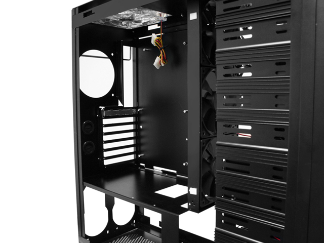 Dietro agli slot per HDD troviamo una staffa con la predisposizione per tre ventole da 120mm di diametro. L'alimentatore (o gli alimentatori) sono posizionati in basso.