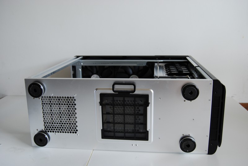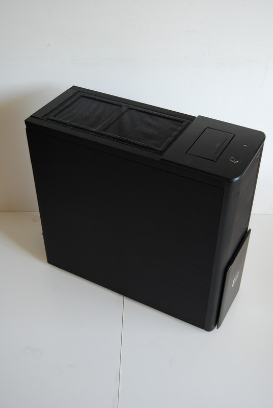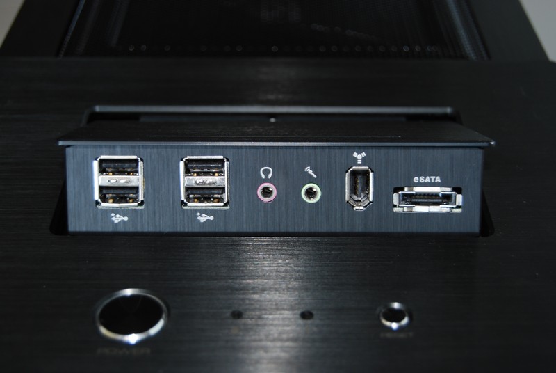 Il tetto è occupato in buona parte dalla griglia che protegge le altre due grandi ventole da 23cm. Sulla parte anteriore sono presenti i tasti di accensione e reset. Un comodissimo pannellino a scomparsa nasconde quattro prese USB, una eSata, una 1394 (Firewire) e i jack per microfono e cuffie.
