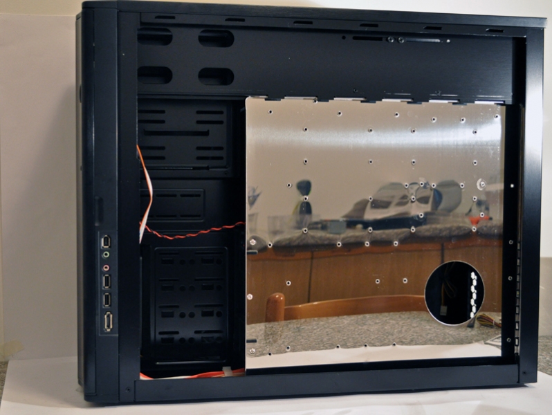 In questa immagine possiamo vedere come si presenta il lato destro del case dopo aver rimosso la semplice paratia nera. La prima cosa che risalta è sicuramente il vassoio cromato dove vengono installati la scheda madre e i suoi componenti. Unica pecca è che non è possibile montare un dissipatore che ha bisogno di una staffa da applicare sul retro della scheda madre senza rimuovere quest’ultima dal case. Il vassoio estraibile è sicuramente una buon cosa e facilita tutte le operazioni di montaggio e smontaggio, ma sicuramente l’assenza del foro per il backplate è una mancanza che in un case di un certo calibro poteva essere evitata. In compenso è presente un foro circolare nella parte bassa del case, presumibilmente da utilizzare per nascondere una parte dei cavi. La posizione e la forma sono però alquanto anomale, sarebbe infatti stato opportuno piazzare dei fori più oblunghi in corrispondenza del connettore ATX della scheda madre e delle varie porte EIDE o Sata. Quel foro circolare può comunque tornare utile per far passare i cavi USB e i cavi del power/reset.