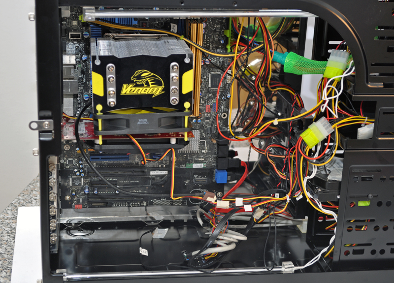 Montiamo il vassoio con i suoi relativi componenti sul case e infine andiamo a montare l’alimentatore nella parte alta. Abbiamo usato un discreto alimentatore non modulare. Come si può vedere dal risultato il tutto è confuso e l’areazione all’interno del case è compromessa da tutto quel groviglio di casi. Sicuramente la situazione può migliorare, ma con un alimentatore modulare la situazione è ben diversa. Purtroppo il case non ci aiuta molto nel nascondere i cavi dell’alimentatore.