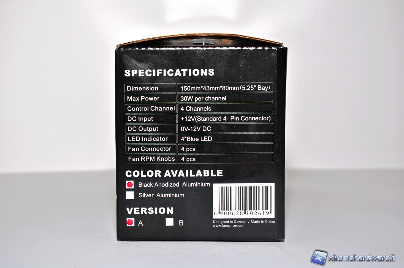Lateralmente troviamo la versione del rheobus, nel nostro caso nera, e le specifiche tecniche riportate in lingua inglese.