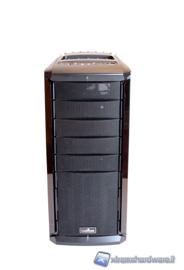 Il frontale è molto elegante e pulito; presenta 5 slot da 5,25" al di sotto dei quali è presente una ventola in immissione da 140mm per il raffreddamento degli HD. La ventola è dotata di LED rossi, per donare riflessi unici durante il funzionamento del PC, ed è munita inoltre di filtro antipolvere, facilmente raggiungibile smontando il pannello frontale con la pressione delle dita.