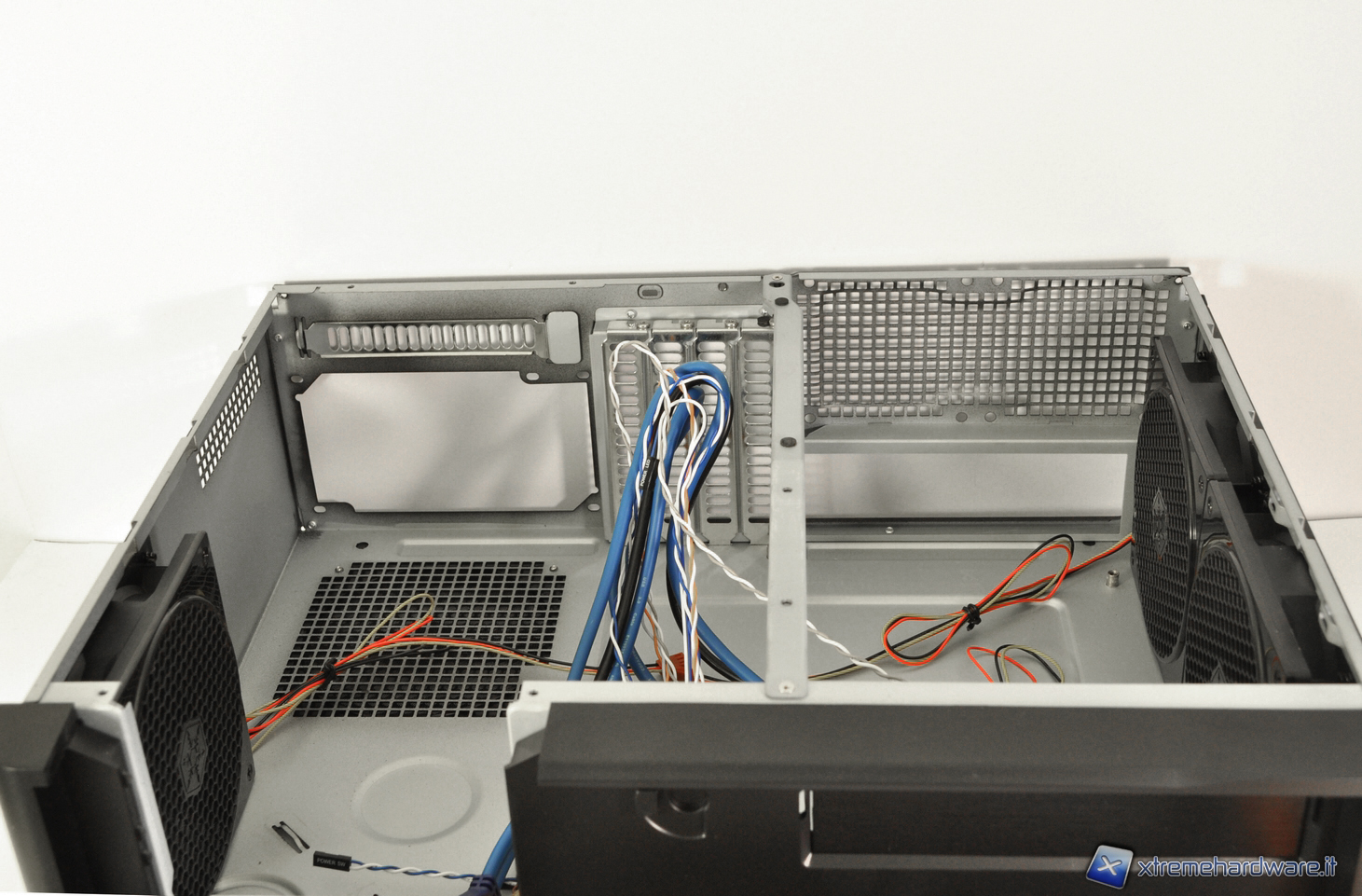 Nella parte posteriore della staffa è presente un divisorio in gomma disegnato per convogliare il flusso d’aria verso le ventole poste sul pannello superiore. Quest’ultimo è dotato di flap che possono essere rimossi per creare ulteriore spazio per facilitare il passaggio dei cavi.