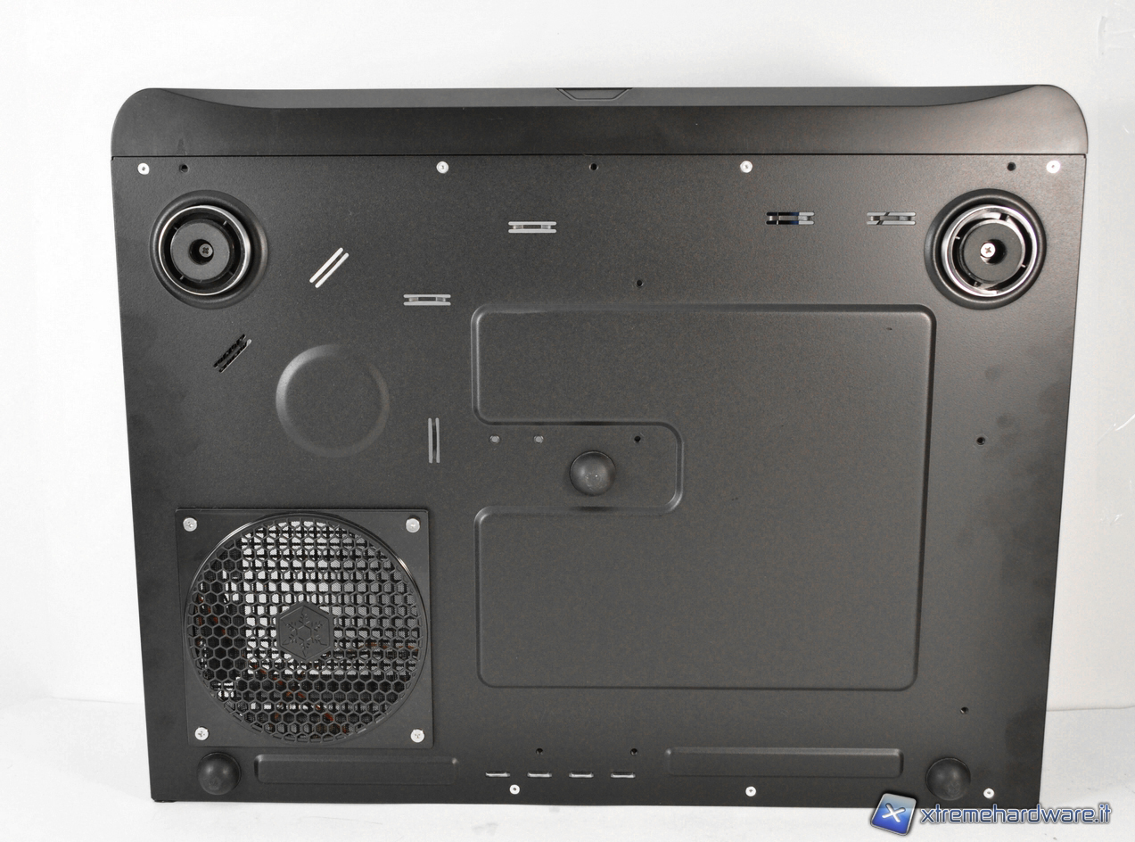 Sulla base del case troviamo 4 solidi supporti anti-scivolo che consentono al case di rimanere ben saldo su qualsiasi superficie. In più è presente una griglia da 120 mm, dotata di filtro-antipolvere, destinata all’alimentatore che consente di installarlo in maniera tale da aspirare l’aria dall’esterno. Questa soluzione farà sì che il flusso d’aria che circola all’interno dell’alimentatore sia completamente indipendente da quello del resto del pc.