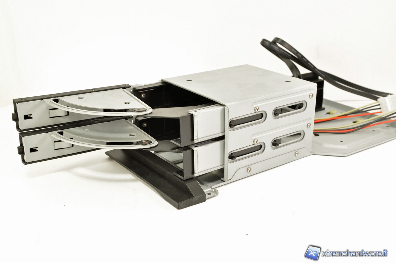 Una volta tolto il coperchio sul tetto ecco come si presenta internamente il nostro case. Possiamo notare principalmente due cose: il vano che ospita il lettore da 5.25’’ e il vano che ospita gli hard-disk hot Swap e tradizionali.  Nelle due immagini di seguito è possibile vedere il cassetto degli hard-disk hot-swap in dettaglio. Si può notare i cavi SATA sul retro da collegare alla scheda madre e i molex a 4 pin.