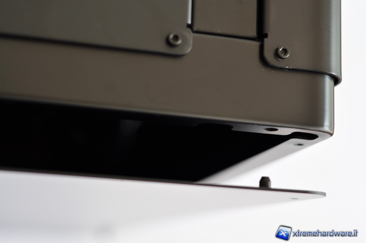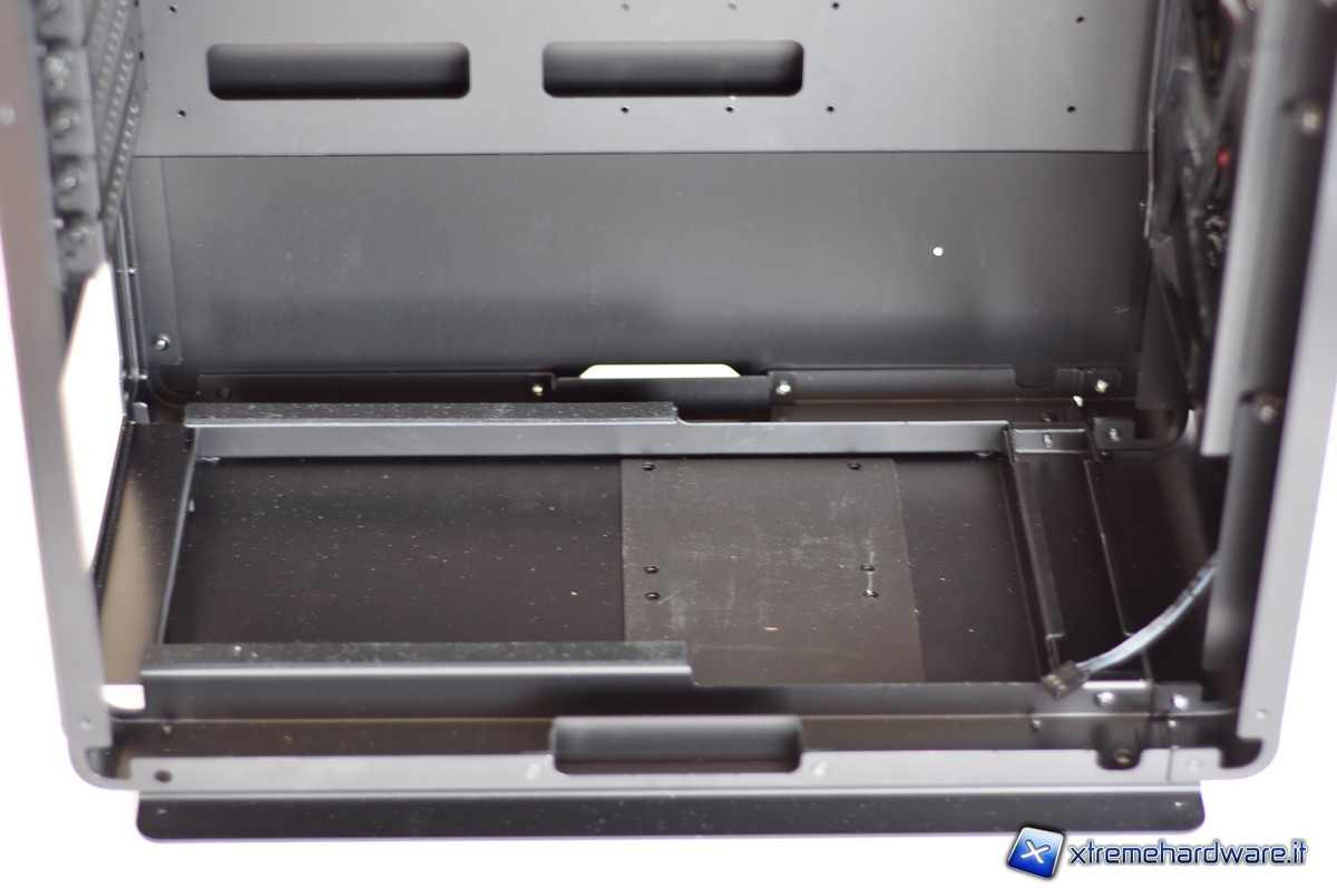 Il fondo del case invece presenta una piattaforma per l’installazione dell’alimentatore e a fianco ci sono dei fori con tanto di zona isolata per l’alloggiamento di 2 device da 2.5”, presumibilmente degli SSD. Una tale configurazione, infatti, permetterebbe di avere il modulo centrale con degli SSD con il sistema operativo in maniera tale da essere una macchina indipendente, e le connessioni agli altri moduli servirebbero solo ad ampliare la capacità di storage di dati e per l’utilizzo di unità ottiche.