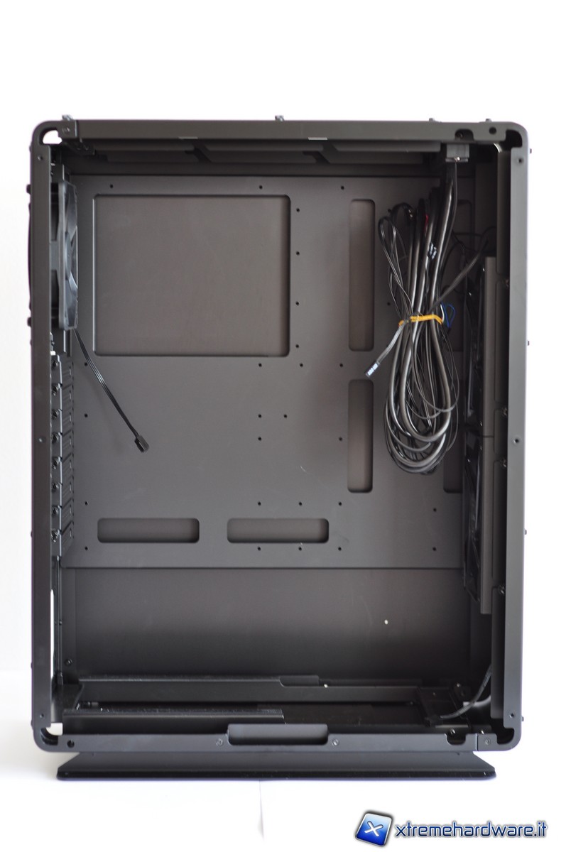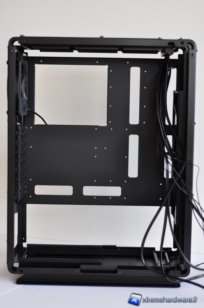Il tray della scheda madre presenta molteplici feritoie per consentire un efficiente cablaggio, anche se non presentano una cornice di gomma. Senza questa protezione l’alluminio potrebbe danneggiare lievemente il rivestimento dei cavi (cosa evitabile utilizzando delle sleeve). Lo spazio tra la paratia e il tray non è enorme ma sufficiente per consentire una più che dignitosa gestione dei cavi.