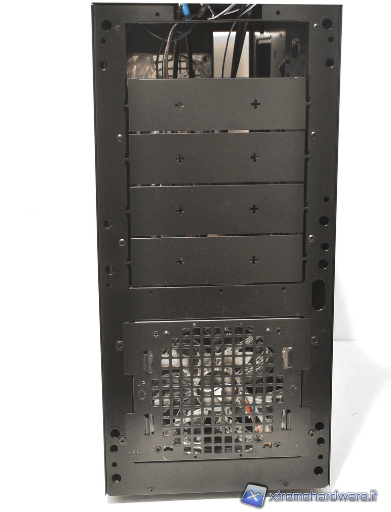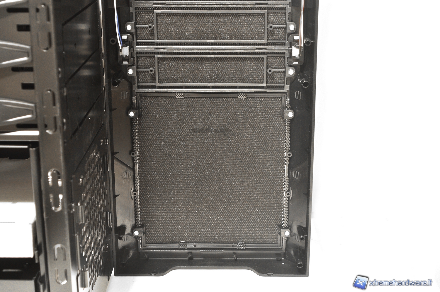 Togliendo, con una leggere trazione, la maschera frontale, possiamo notare meglio nella parte alta i copri-slot da 5.25’’ ed in basso la ventola da 120mm. Notare come il filtro antipolvere della ventola non è collocato nella struttura del case, bensì nella paratia rimuovibile. Analogamente tutti i copri slot mesh, sono dotati internamente di filtro antipolvere.