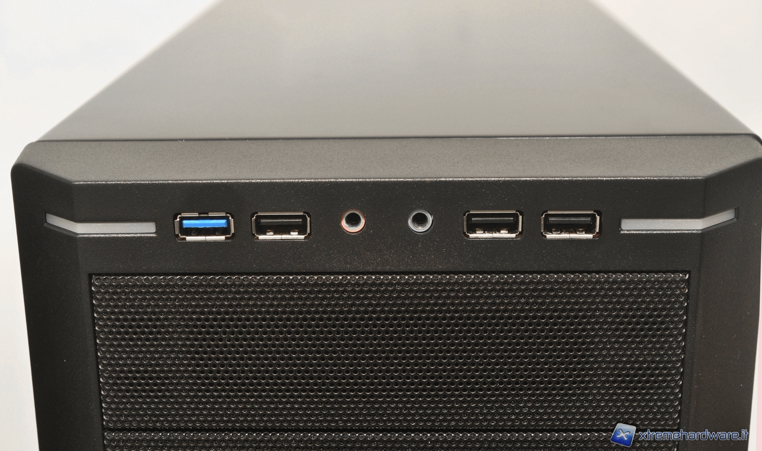 Nella parte superiore della paratia frontale troviamo ai due lati gli indicatori di stato: uno che si accende quando l’hard-disk entra in funzione e l’altro si accende all’avvio del nostro sistema. Partendo da sinistra troviamo una porta USB 3.0, una porta USB 2.0, jack per il microfono, jack per le cuffie e altre 2 porte USB 2.0.