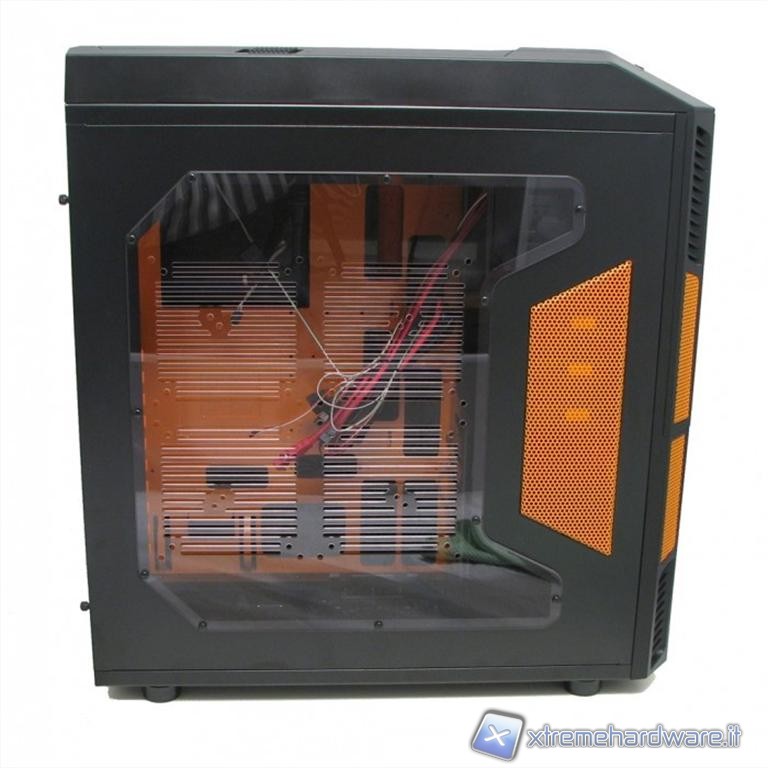 Lateralmente il case presenta una grande finestra laterale in plexyglass, caratterizzata da un design molto aggressivo e accattivante. Su tale pannello sarà possibile installare fino a 4 ventole da 12/14cm di diametro o una da 18/20cm.  Al suo fianco è presenti un’ulteriore griglia di colore arancione sempre in mesh a nido d’ape. L'altro versante del case invece è completamente chiuso ma rimuovibile lo stesso.