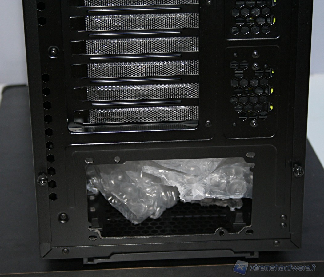 L’organizzazione del case, posteriormente, è classica, sebbene però troviamo degli spunti interessanti ovvero uno spessore laterale davvero pronunciato (che permetterà l’installazione di dissipatori molto ingombranti in altezza), ben quattro fori per il passaggio di sistemi a liquido e una ventola da 140mm in estrazione. Sono presenti numerosi fori di ventilazione, sia sui copri-slot PCI proprietari di Akasa, sia sulla parte laterale e centrale. La posizione dell’alimentatore è come di consueto in basso. Al di sotto di esso troviamo un comodissimo filtro antipolvere, la cui rimozione è facilitata da un sistema a scorrimento orizzontale. Ottima comunque sia la finitura che la solidità strutturale.