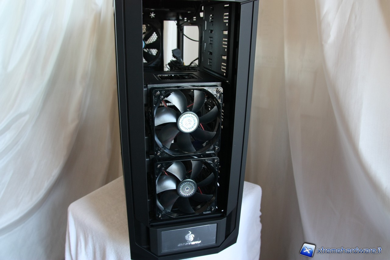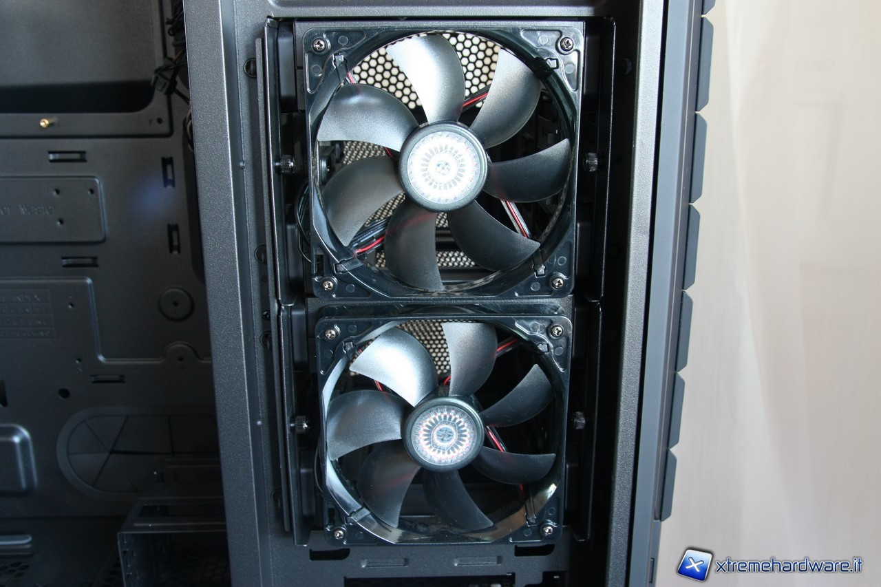 Notiamo anche le ventole adibite al raffreddamento degli hard drive, che troveremo installate dietro al pannello laterale sinistro in modo tale da creare un flusso d'aria omogeneo per smaltire direttamente il calore generato dalle periferiche di memorizzazione, senza influire sul resto del PC.