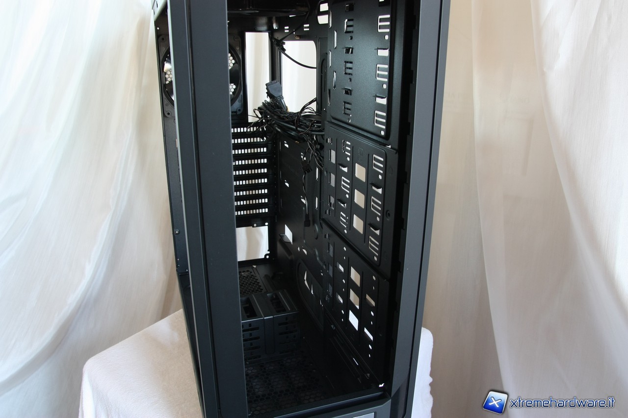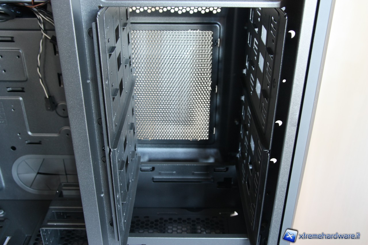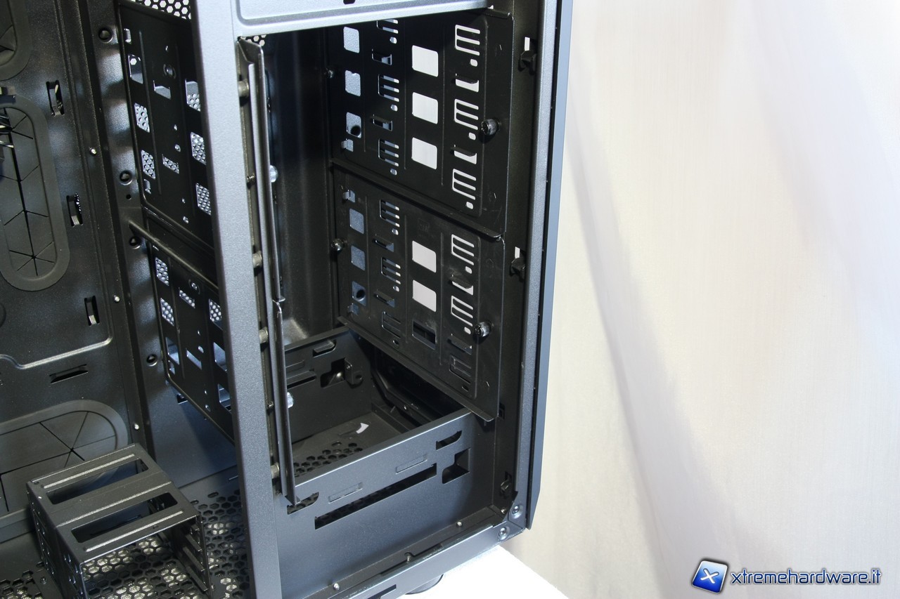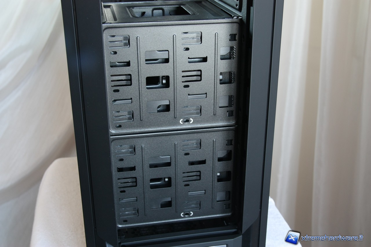A questo punto potremo rimuovere i due cestelli per gli hard disk, segnaliamo anche qui l'estrema cura dei particolari, i fili delle ventole sono infatti fissate alla struttura del cage.