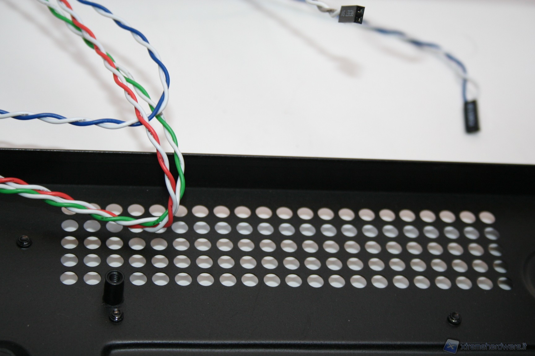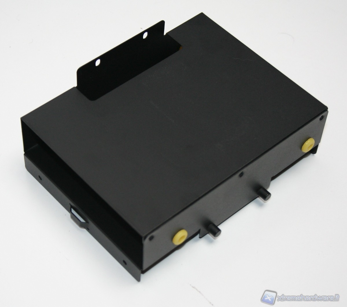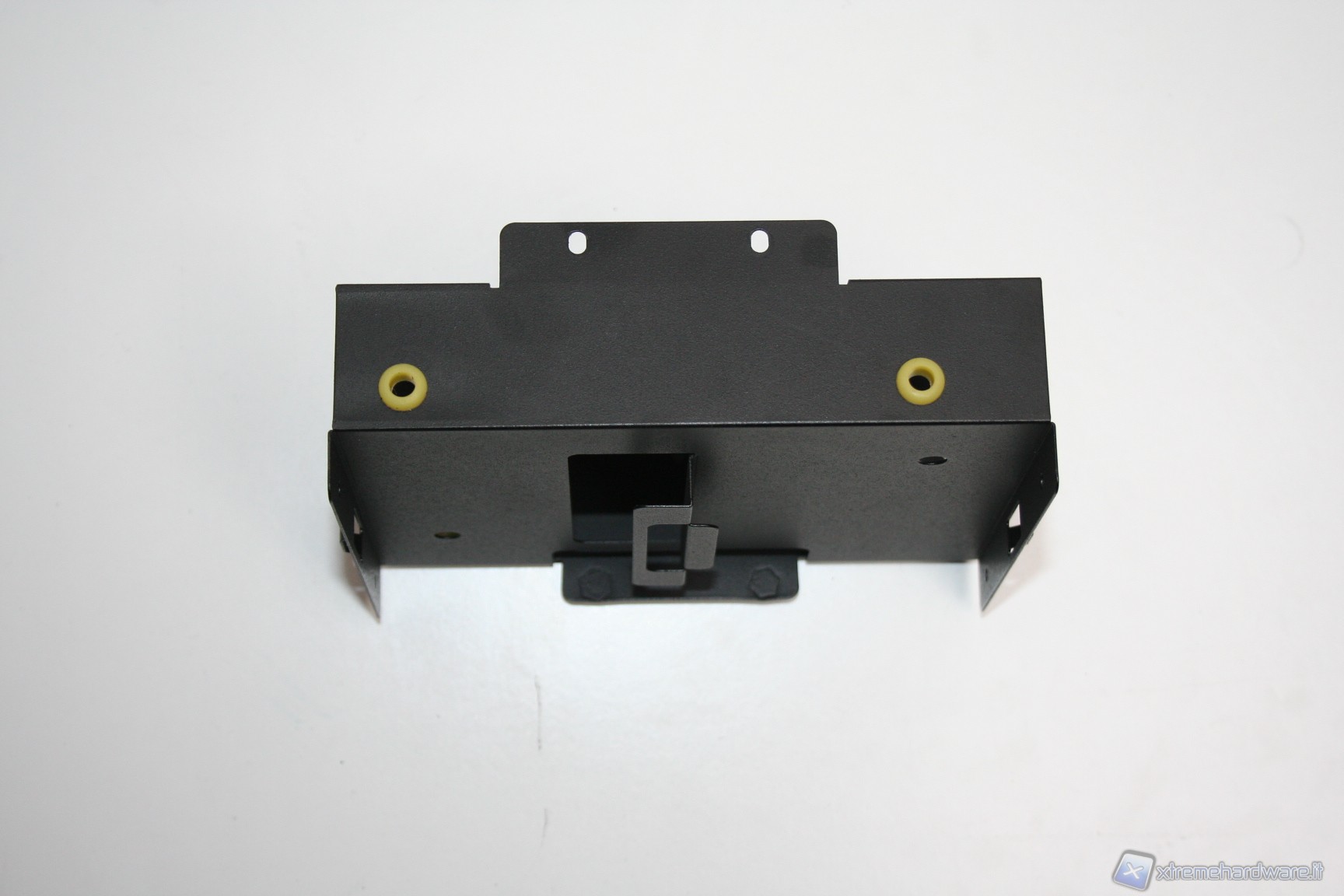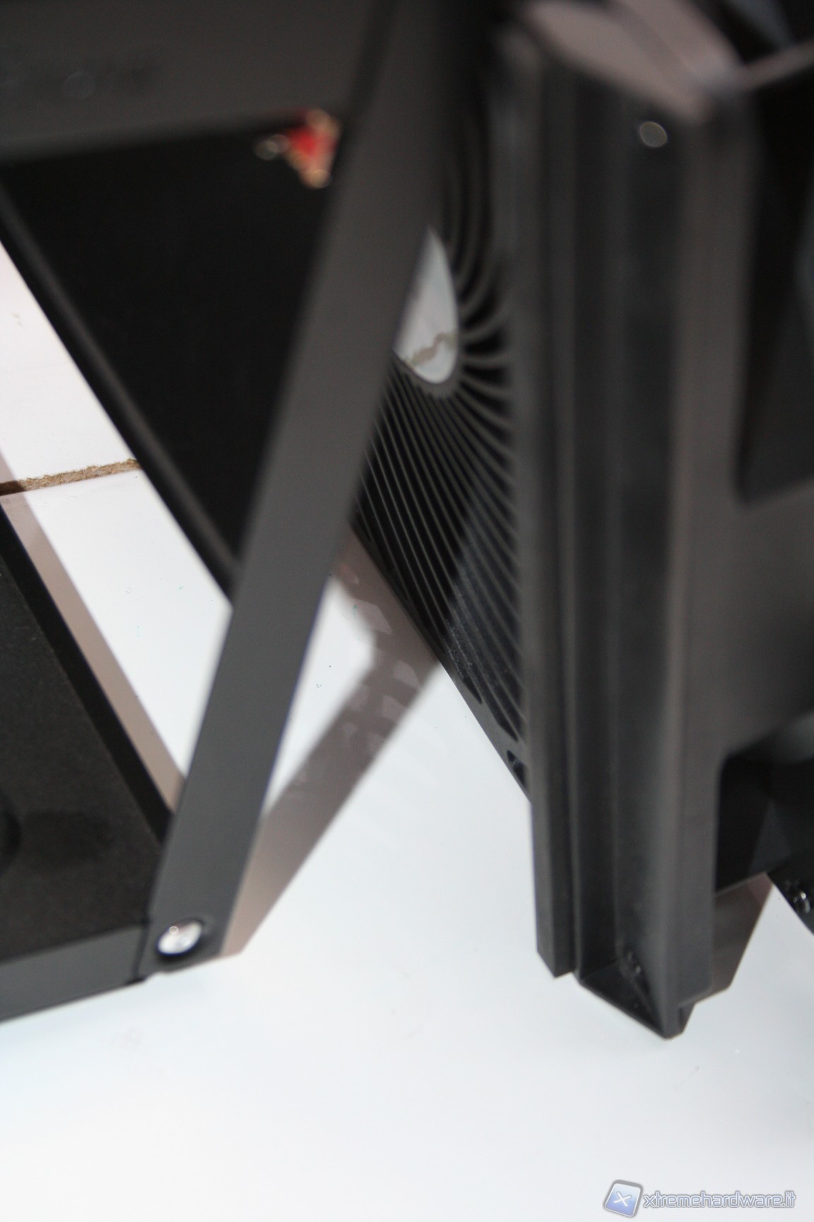 Rimossa la paratia laterale e superiore, che forma un corpo unico, possiamo subito notare la peculiare struttura interna. E’ immediatamente visibile il grande filtro antipolvere della ventola da 180mm, facilmente rimovibile tramite un sistema a scorrimento. Guardando più avanti si nota un alloggiamento per due SSD o hard disk da 2.5”, rimovibile tramite delle semplici viti. Eliminando questo alloggiamento possiamo installare un hard disk da 3,5”, all’interno dell’unico bay predisposto, e dotato di profili gommati antivibrazione. Rimuovendo sia l’alimentatore, sia i bay dei dischi, ci rendiamo conto di quanto in realtà lo spazio possa esser stato ottimizzato e studiato. Da notare il cavo di alimentazione che parte dalla porzione inferiore destra, frontalmente, e termina, mediante fascettatura tramite linguette metalliche, all’estremità posteriore sinistra, in alto. Il meccanismo di fissaggio dell’unica ventola da 180mm è ad incastro, e la rimozione è davvero facile. Molto caratteristico anche il sistema di bloccaggio delle periferiche addizionali, quali ad esempio la scheda video. E’ necessario smontare delle viti nella porzione posteriore, smontare poi i due bracket ed infine rimontare tutto, di modo che si blocchi automaticamente. I bracket sono inoltre ventilati.