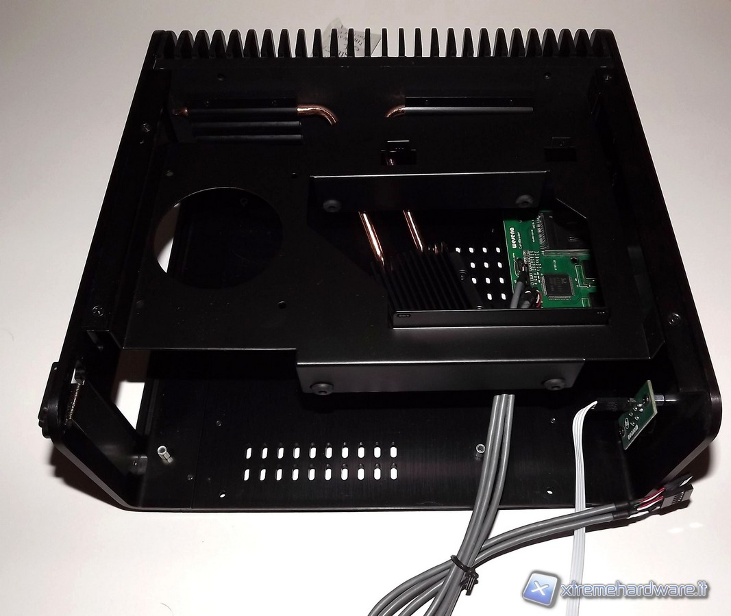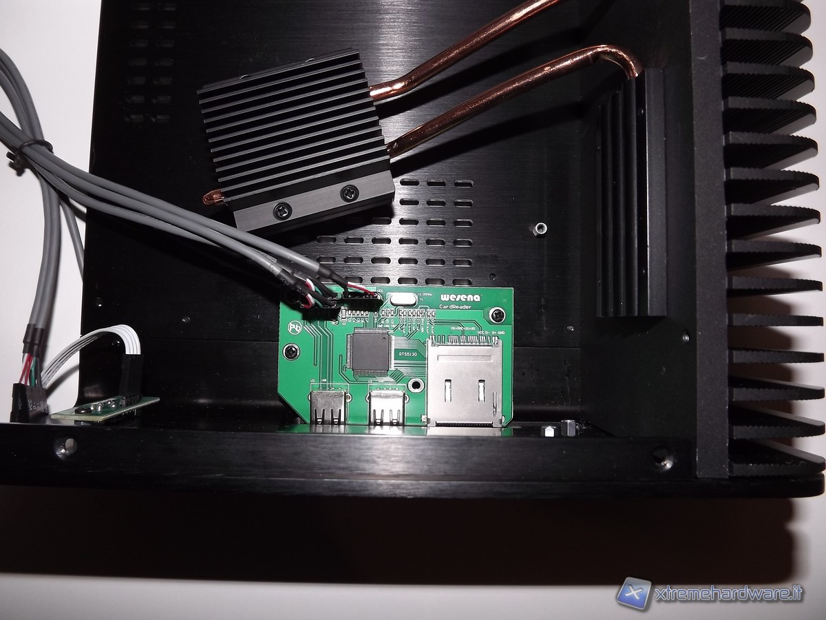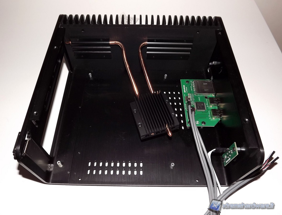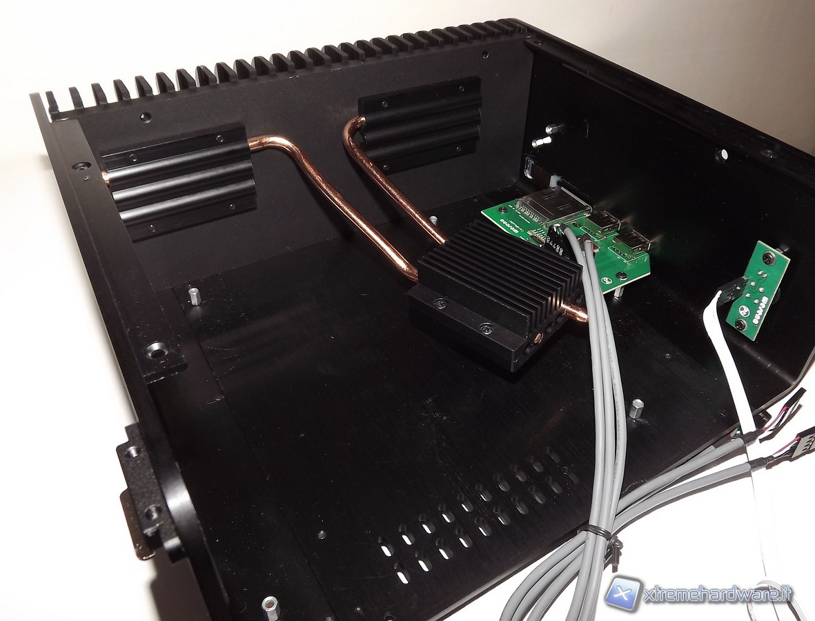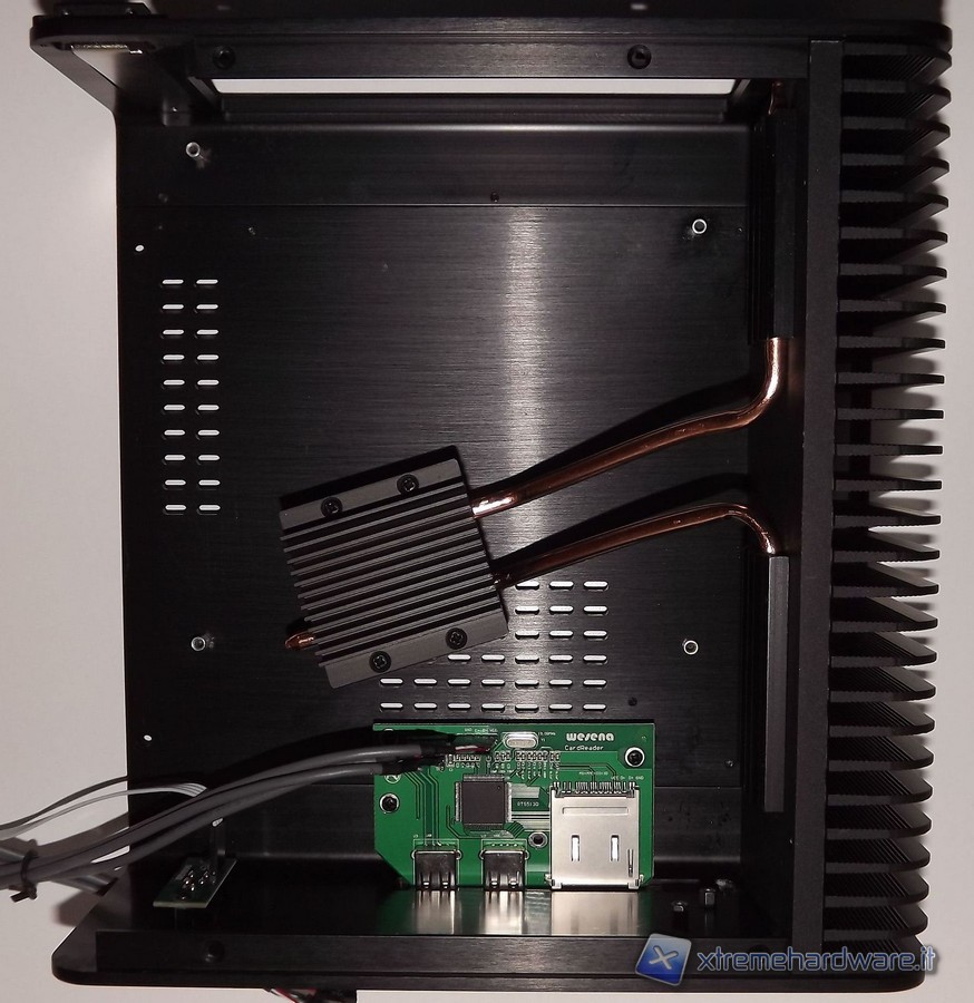 Si nota anche il sistema di raffreddamento passivo che è composto, come vedremo meglio, da più parti. Si notano le due Heat-pipe che trasferiscono il calore prodotto dalla CPU al sistema di dissipazione del pannello laterale.
