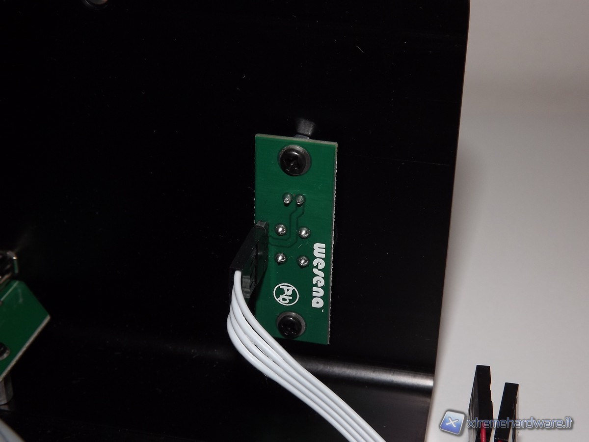 Sulla parete frontale sono presenti due schede con relativo PCB di colore verde prodotte direttamente da Wesena. La prima scheda più grande ospita la circuteria relativa alle porte USB e al Card Reader. La seconda scheda, invece, è posta immediatamente dietro al pulsante di accensione, dove troviamo anche il LED di accensione. Accanto alla scheda più grande è possibilie installare il ricevitore IR opzionale, ci sono già i due distanziatori installati per poter inserire l'apposita scheda.