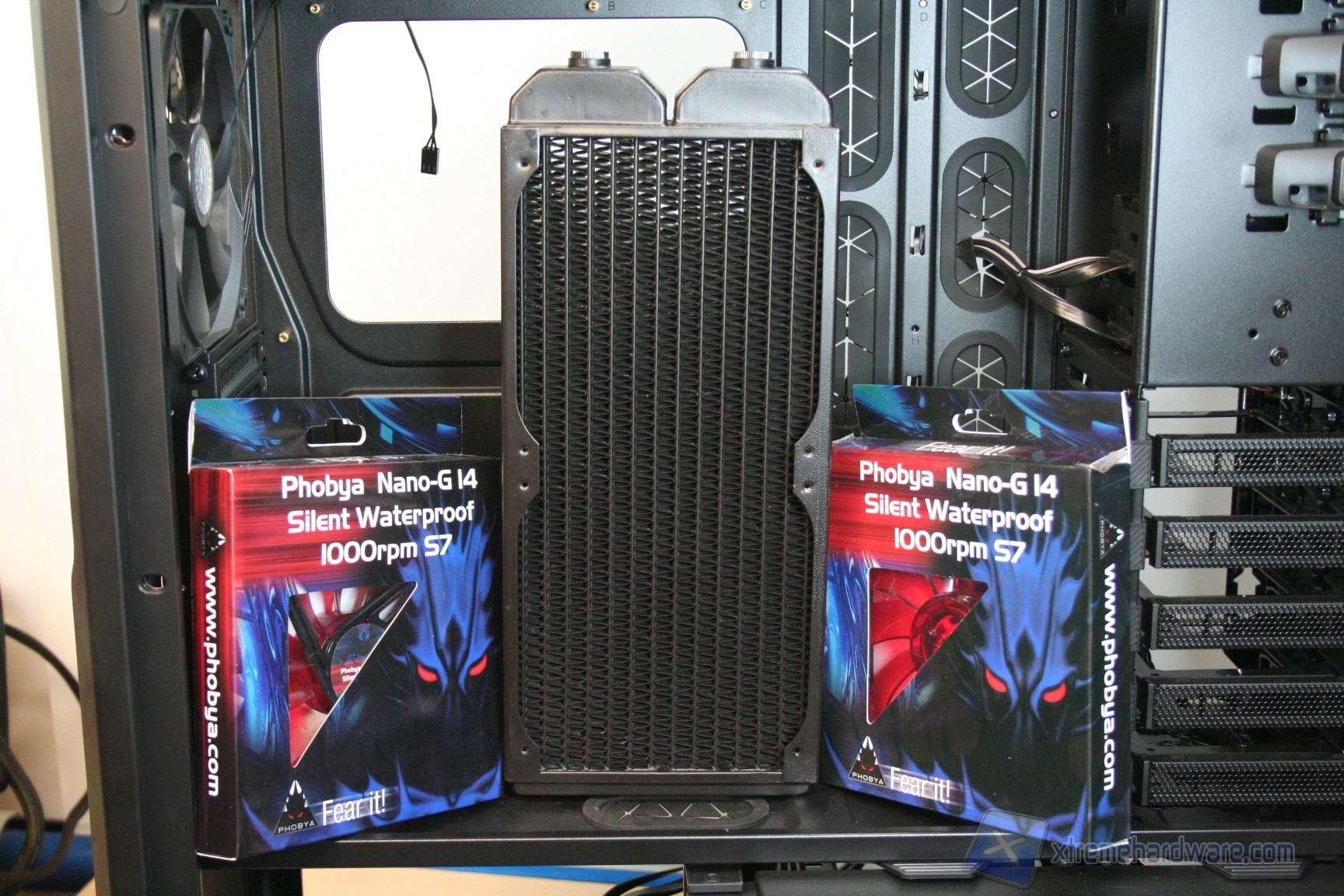 Per quanto riguarda il Phobya invece è possibile integrarlo nella stessa posizione dell’Alphacool, ma non superiormente, per via del fatto che collide con la struttura che tiene fermo il pannello superiore, similmente a quanto accaduto con l’Alphacool. Una volta fissato occupa moltissimo spazio, ma è indubbio che questo sistema permetterà prestazioni eccellenti. Da notare che putroppo i fori nella paratia superiore (quelli per il passaggio dell’aria) sono da 120mm e quindi il beneficio di un radiatore da 280mm sarebbe limitato da questo particolare. Anche in questo caso sarebbe opportuno apportare delle modifiche al pannello superiore, magari con l’ausilio di un Dremel. Occorre inoltre riporre particolare attenzione con radiatori dall'elevato spessore per la compatibilità con i moduli RAM, i quali potrebbero scontrarsi con l'estermità inferiore del radiatore o di eventuali ventole in push aggiuntive.