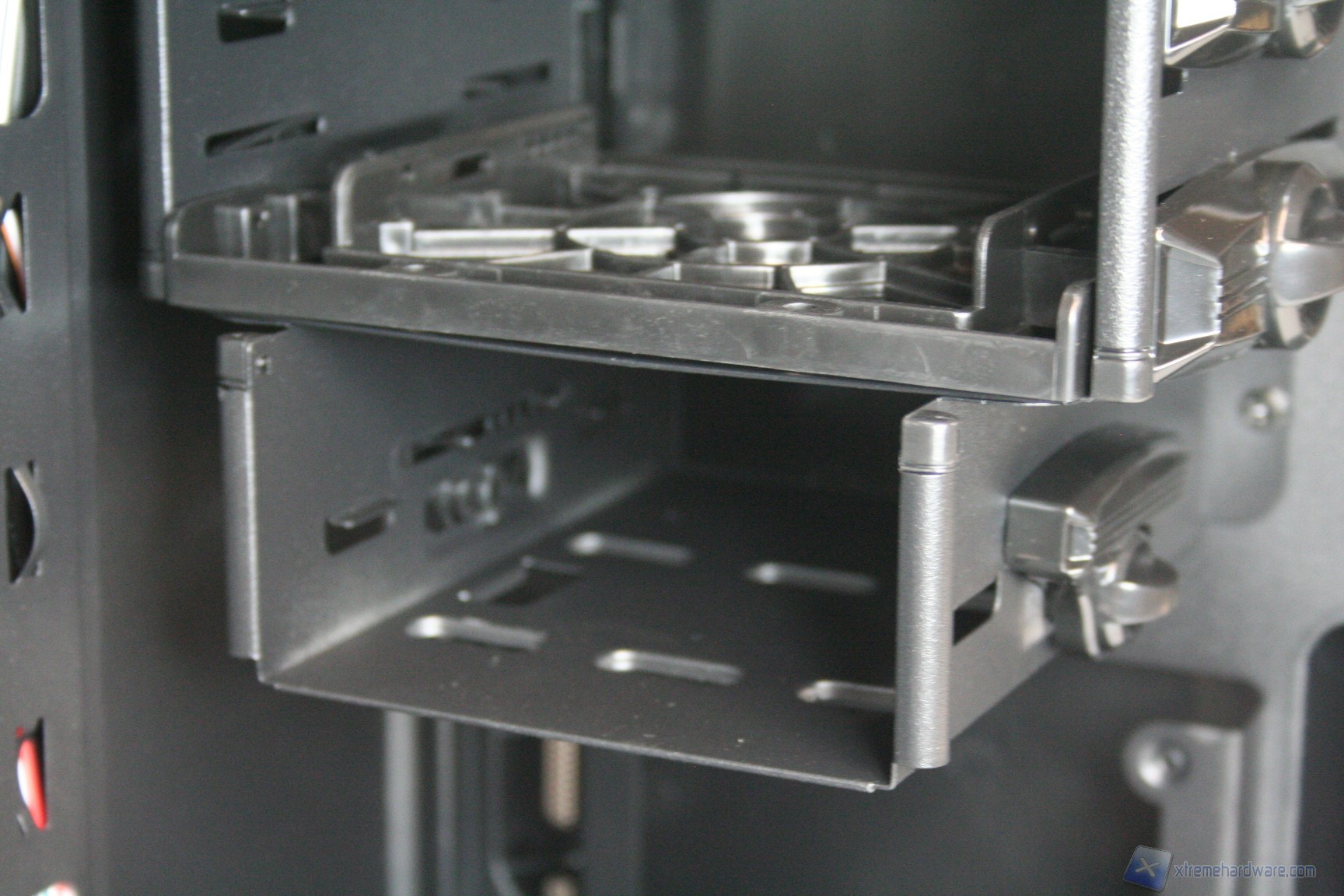 La gestione degli hard disk presenta una particolare conformazione a due cage, uno dei quali facilmente removibile per far spazio a lunghe schede video, e l’altro, inferiore, removibile solo con una procedura più complessa (sono presenti dei rivetti). I cage supportano fino ad un totale di 5 dischi da 3.5” e sono dotati di due differenti tipi di aggancio: il cage più grande tramite slitte e quello in basso, con disposizione ortogonale al precedente, tramite meccanismo di blocco rotazionale. Lo stesso tipo di aggancio tool-less è previsto per gli slot da 5,25”. Purtroppo non c’è compatibilità con SSD e hard disk da 2,5” se non tramite adattatori a 3,5” non inclusi nel cabinet.
