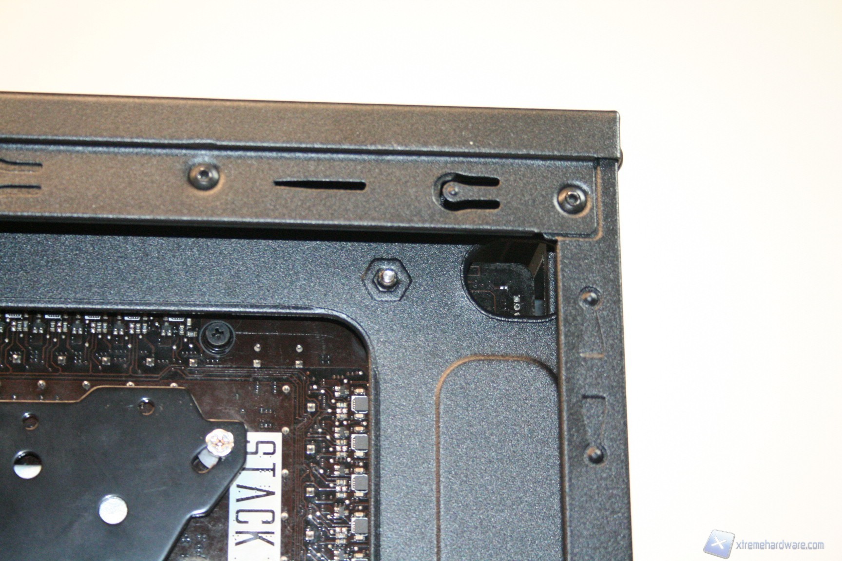 Il piatto della scheda madre, in acciaio piuttosto sottile, si presenta con numerosissimi profilati e fermacavi integrati e non è removibile. Qualitativamente buono, è stabile e pratico, anche se sono presenti poche aperture passacavi. Ciò non rappresenta però un problema perché ad esempio, nella parte superiore, non ci sarà il minimo problema nemmeno per l’odiosa installazione del connettore di alimentazione da 8 PIN della CPU; è presente una grande apertura posteriore per le procedure di installazione di dissipatori aftermarket. Supporta 7 slot PCI per il montaggio di periferiche addizionali, non ci sarà quindi compatibilità con schede video ingombranti nell’ultimo slot PCI-E (un problema marginale considerando il target di utenza). Una nota inerente al cablaggio: subito sotto il cestello dei dischi rigidi c’è un grande spazio vuoto. Questo permetterà con facilità un ottimo assemblaggio e cablaggio dei cavi, aumentando quindi il grado di ordine e non creando ristagni d’aria calda.