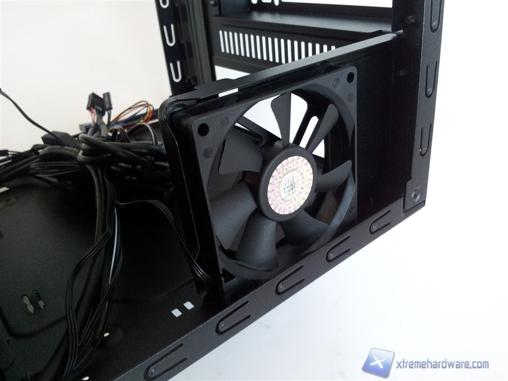 Sarà possibile installare una ventola da 120mm tra la mainboard e il cestello degli hard disk: Cooler Master mette a disposizione delle particolari viti in plastica dura che permetteranno di attaccare la ventola al cestello senza l'utilizzo di un cacciavite.